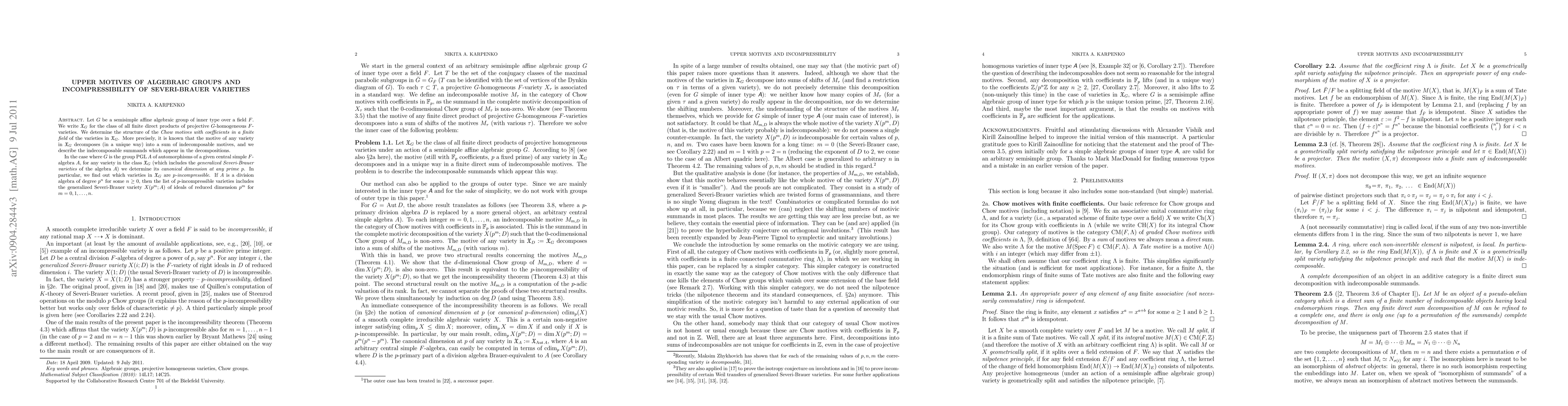 This paper investigates the structure of Chow motives for semisimple affine algebraic groups and their associated projective homogeneous varieties, focusing on the incompressibility of Severi-Brauer varieties. It determines the indecomposable motives within the Chow group and identifies which generalized Severi-Brauer varieties are incompressible at various primes.