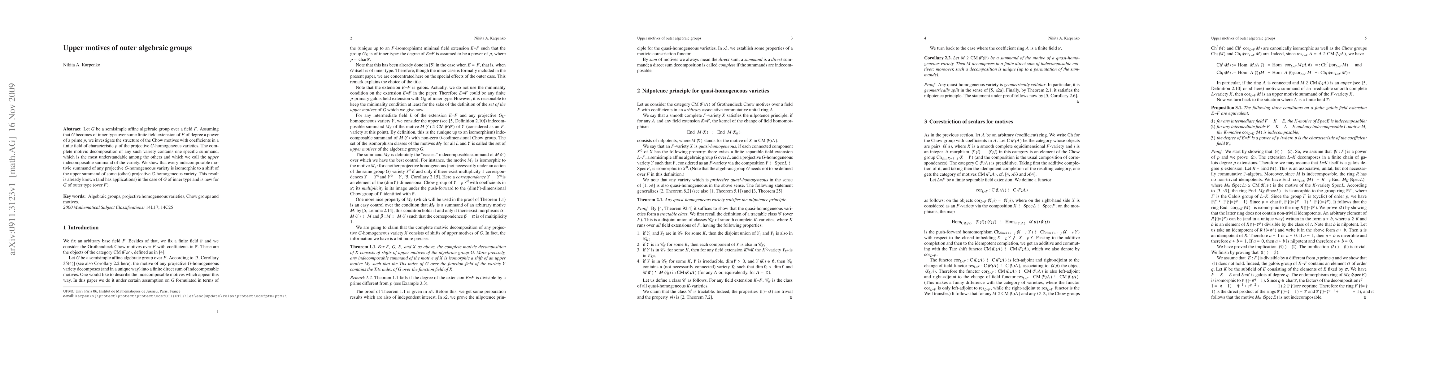 Let G be a semisimple affine algebraic group over a field F. Assuming that G becomes of inner type over some finite field extension of F of degree a power of a prime p, we investigate the structure of the Chow motives with coefficients in a finite field of characteristic p of the projective G-homogeneous varieties. The complete motivic decomposition of any such variety contains one specific summand, which is the most understandable among the others and which we call the upper indecomposable summand of the variety. We show that every indecomposable motivic summand of any projective G-homogeneous variety is isomorphic to a shift of the upper summand of some (other) projective G-homogeneous variety. This result is already known (and has applications) in the case of G of inner type and is new for G of outer type (over F).