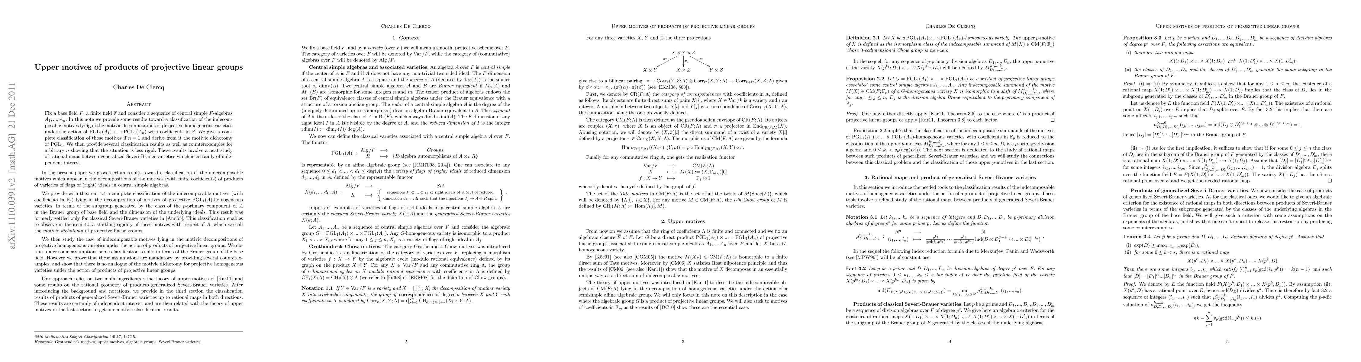 Fix a base field F, a finite field K and consider a sequence of central simple F-algebras A_1,...,A_n. In this note we provide some results toward a classification of the indecomposable motives lying in the motivic decompositions of projective homogeneous varieties under the action of PGL(A_1)x...xPGL(A_n) with coefficients in K. We give a complete classification of those motives if n=1 and derive from it the motivic dichotomy of projective linear groups. We then provide several classification results as well as counterexamples for arbitrary n showing that the situation is less rigid. These results involve a neat study of rational maps between generalized Severi-Brauer varieties which is certainly of independent interest.