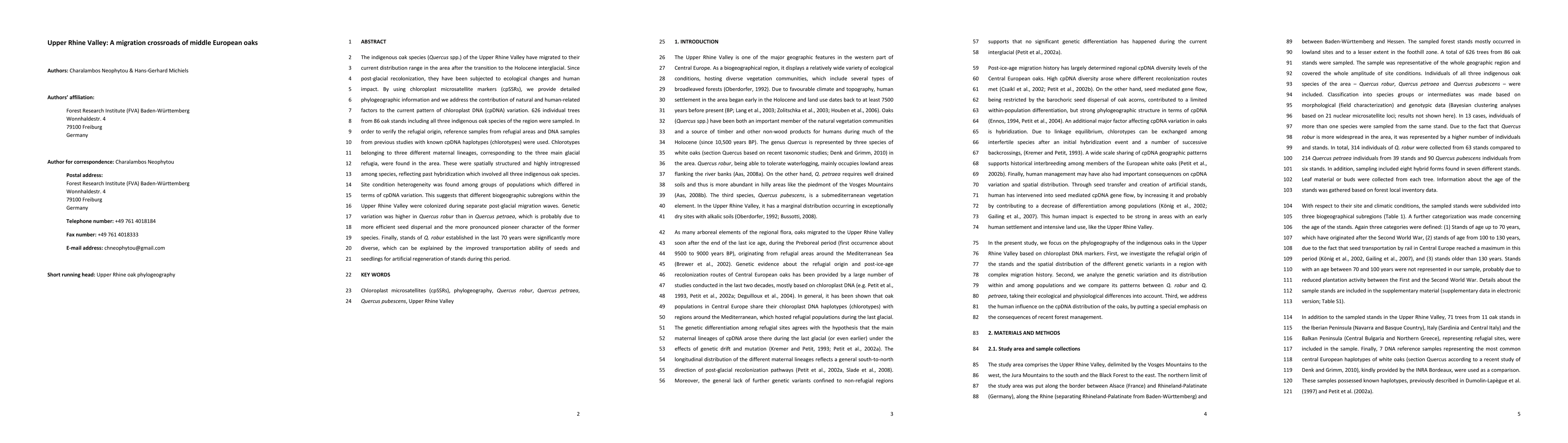 The study of oak species in the Upper Rhine Valley using chloroplast microsatellite markers reveals three glacial refugia origins and significant hybridization among species, with higher genetic diversity in Quercus robur. Recent human-assisted regeneration has further increased genetic diversity in younger stands.