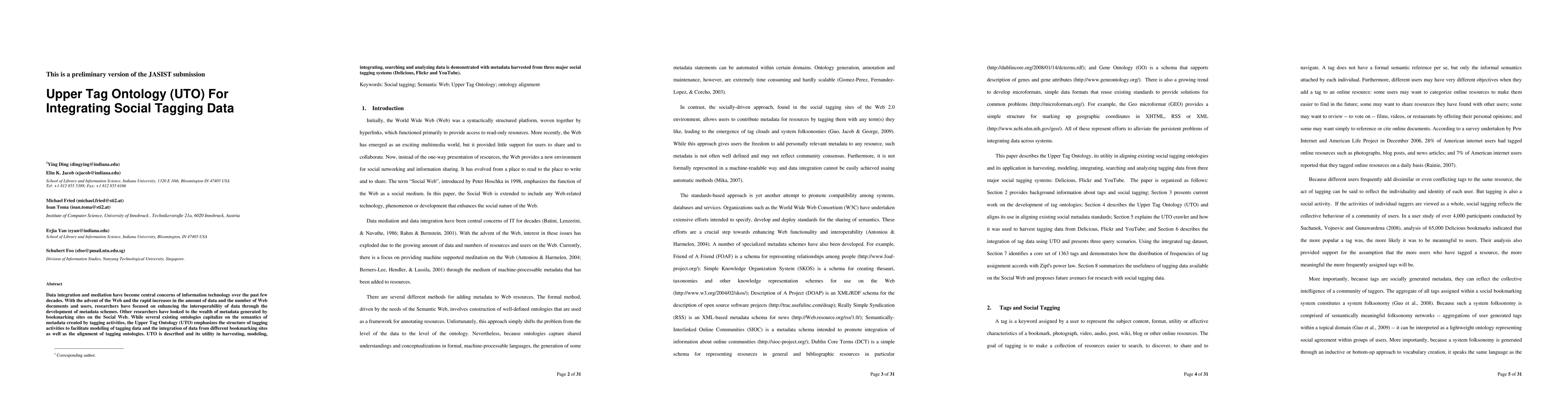 The Upper Tag Ontology (UTO) aims to enhance the interoperability of data by modeling tagging activities and integrating data from various social bookmarking sites. Demonstrated with metadata from Delicious, Flickr, and YouTube, UTO facilitates data alignment, search, and analysis.