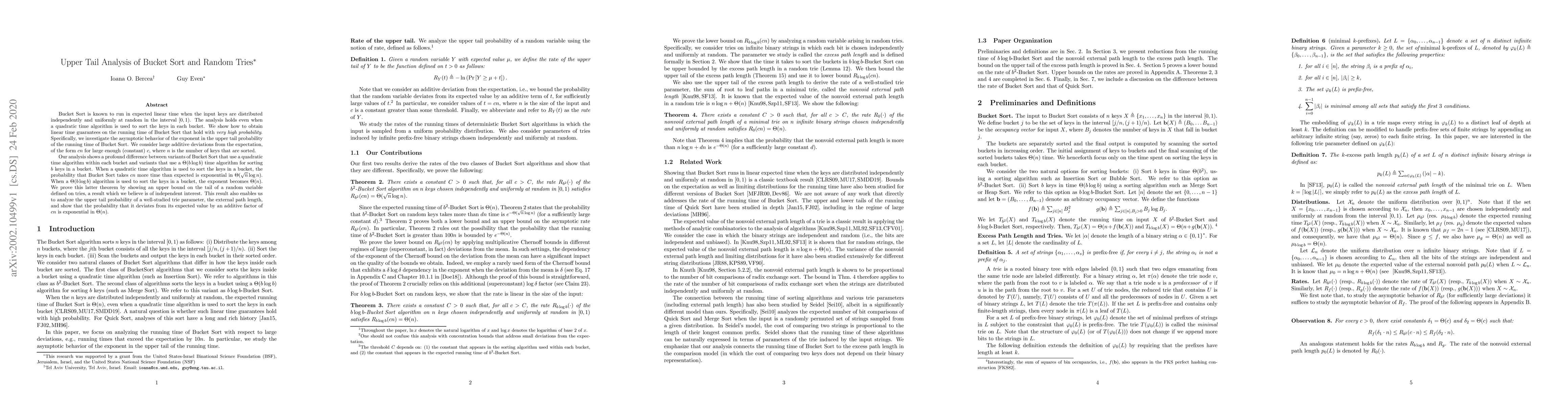 This paper analyzes the upper tail behavior of Bucket Sort, showing that when using a quadratic time algorithm within each bucket, the probability of significant deviations is exponential in $\Theta(\sqrt{n}\log n)$. In contrast, using a $\Theta(b\log b)$ algorithm for sorting within each bucket results in an exponential decay in $\Theta(n)$. The analysis also extends to Random Tries, revealing similar exponential decay in the upper tail for their external path length.
