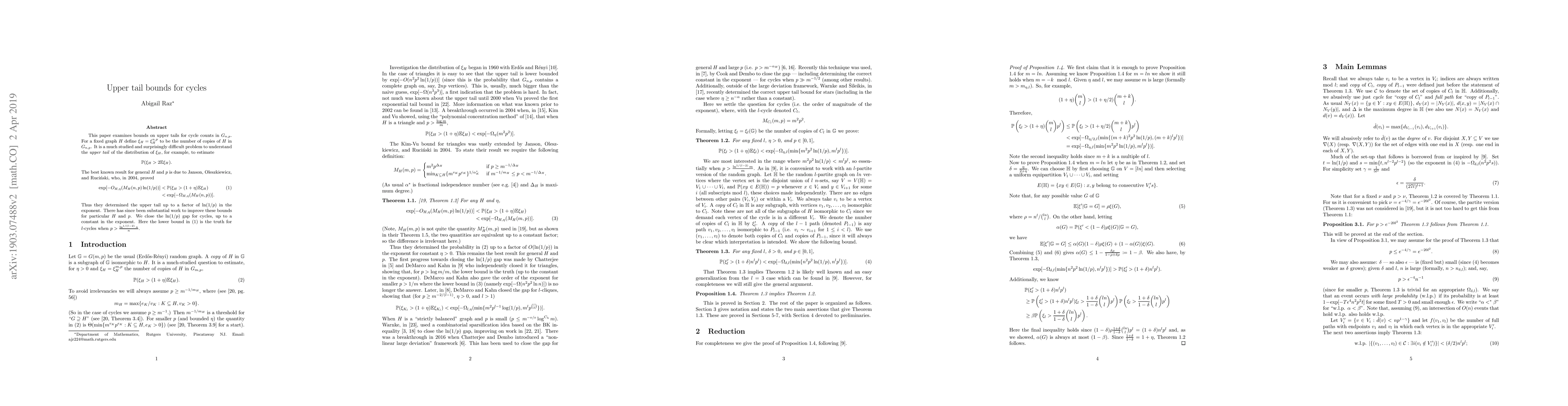 This paper examines bounds on upper tails for cycle counts in $G_{n,p}$. For a fixed graph $H$ define $\xi_H= \xi_H^{n,p}$ to be the number of copies of $H$ in $G_{n,p}$. It is a much studied and surprisingly difficult problem to understand the upper tail of the distribution of $\xi_H$, for example, to estimate \begin{equation*} \mathbb{P}(\xi_H > 2 \mathbb{E}\xi_H). \end{equation*} The best known result for general $H$ and $p$ is due to Janson, Oleszkiewicz, and Ruci\'nski, who, in 2004, proved \begin{align}\label{a:JOR} \exp[-O_{H, \eta}(M_H(n,p) \ln(1/p))]&<\mathbb{P}(\xi_H > (1+\eta)\mathbb{E} \xi_H)\\&<\exp[-\Omega_{H, \eta}(M_{H}(n,p))].\nonumber \end{align} Thus they determined the upper tail up to a factor of $\ln(1/p)$ in the exponent. There has since been substantial work to improve these bounds for particular $H$ and $p$. We close the $\ln(1/p)$ gap for cycles, up to a constant in the exponent. Here the lower bound given by JOR is the truth for $l$-cycles when $p> \frac{\ln^{1/(l-2)}n}{n}$.