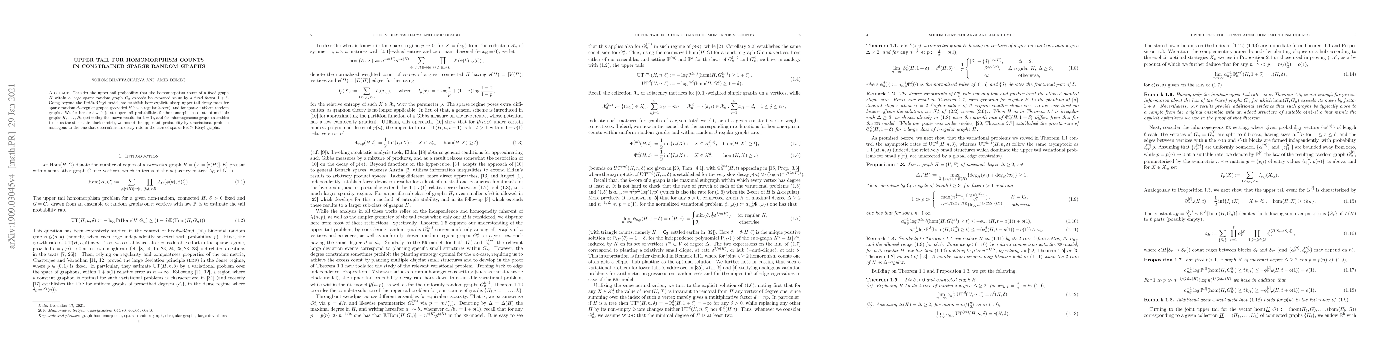 This paper establishes sharp upper tail decay rates for homomorphism counts in constrained sparse random graphs, extending beyond the Erdős-Rényi model to $d_n$-regular and uniform random graphs. It also addresses joint upper tail probabilities for multiple graph homomorphism counts and inhomogeneous graph ensembles like the stochastic block model.