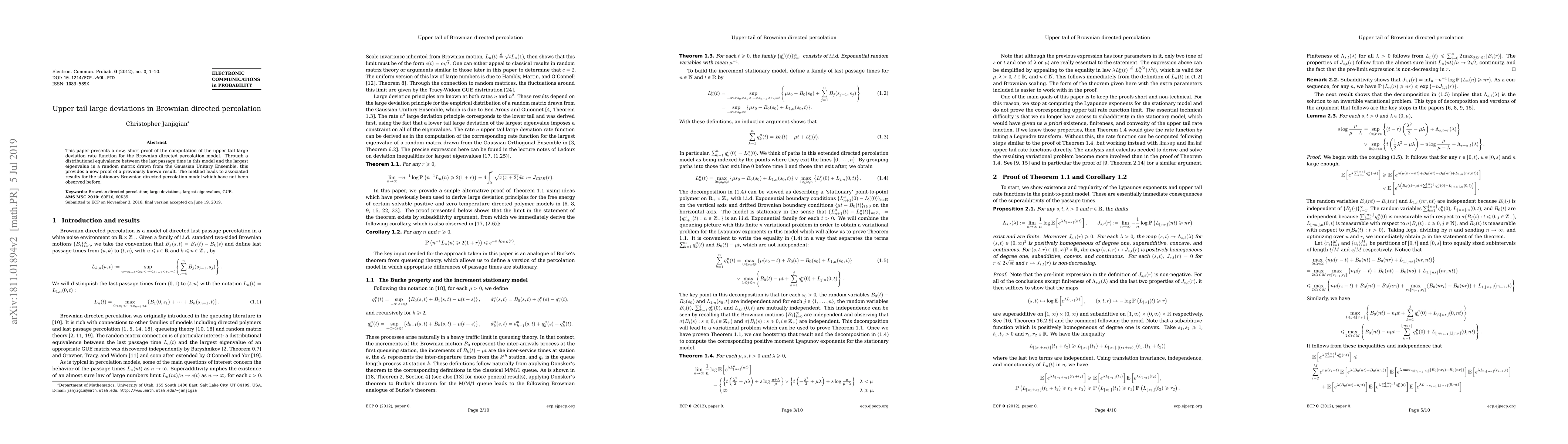 This paper offers a concise proof for the upper tail large deviation rate function in Brownian directed percolation, establishing a distributional equivalence with the largest eigenvalue in Gaussian Unitary Ensemble random matrices. It also reveals new results for the stationary Brownian directed percolation model.