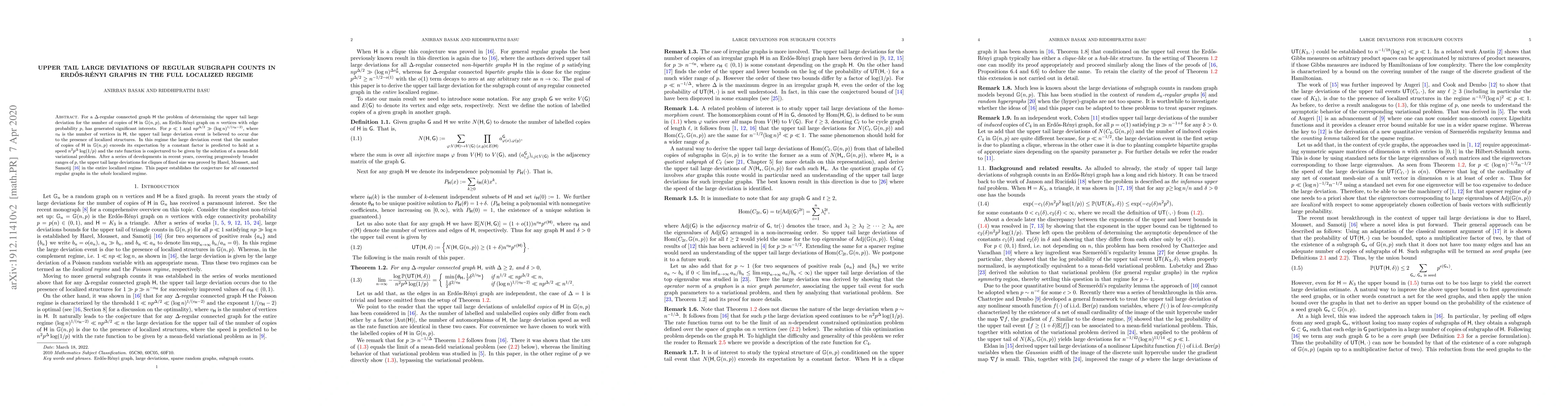For a $\Delta$-regular connected graph ${\sf H}$ the problem of determining the upper tail large deviation for the number of copies of ${\sf H}$ in $\mathbb{G}(n,p)$, an Erd\H{o}s-R\'{e}nyi graph on $n$ vertices with edge probability $p$, has generated significant interests. For $p\ll 1$ and $np^{\Delta/2} \gg (\log n)^{1/(v_{\sf H}-2)}$, where $v_{\sf H}$ is the number of vertices in ${\sf H}$, the upper tail large deviation event is believed to occur due to the presence of localized structures. In this regime the large deviation event that the number of copies of ${\sf H}$ in $\mathbb{G}(n,p)$ exceeds its expectation by a constant factor is predicted to hold at a speed $n^2 p^{\Delta} \log (1/p)$ and the rate function is conjectured to be given by the solution of a mean-field variational problem. After a series of developments in recent years, covering progressively broader ranges of $p$, the upper tail large deviations for cliques of fixed size was proved by Harel, Mousset, and Samotij \cite{hms} in the entire localized regime. This paper establishes the conjecture for all connected regular graphs in the whole localized regime.
