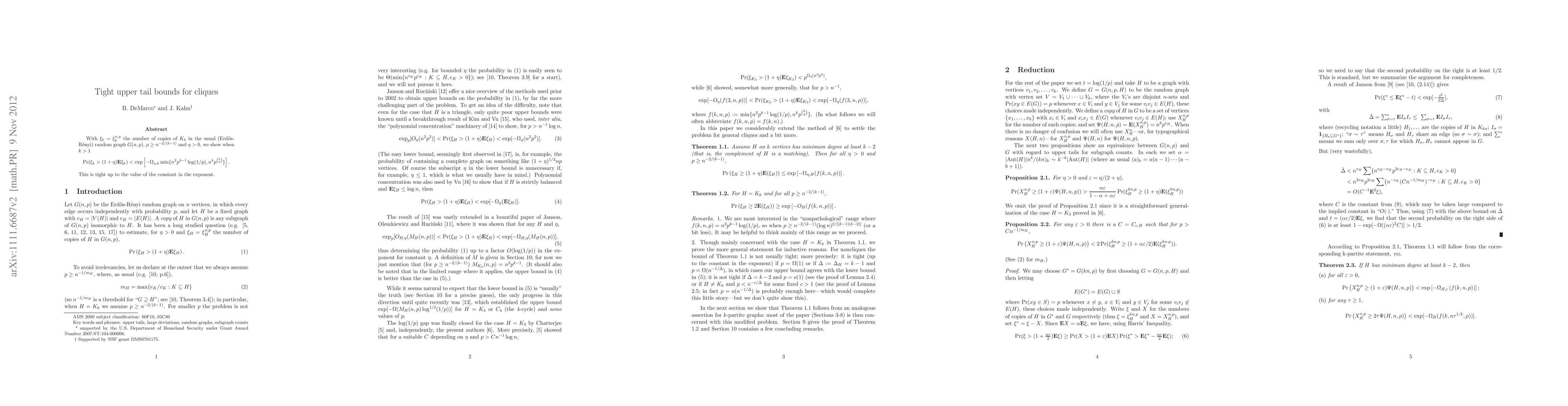 With $\xi_{k}=\xi_{k}^{n,p}$ the number of copies of $K_k$ in the usual (Erd\H{o}s-R\'enyi) random graph $G(n,p)$, $p\geq n^{-2/(k-1)}$ and $\eta>0$, we show when $k>1$ $$\Pr(\xi_k> (1+\eta)\E \xi_k) < \exp [-\gO_{\eta,k} \min\{n^2p^{k-1}\log(1/p), n^kp^{\binom{k}{2}}\}].$$ This is tight up to the value of the constant in the exponent.