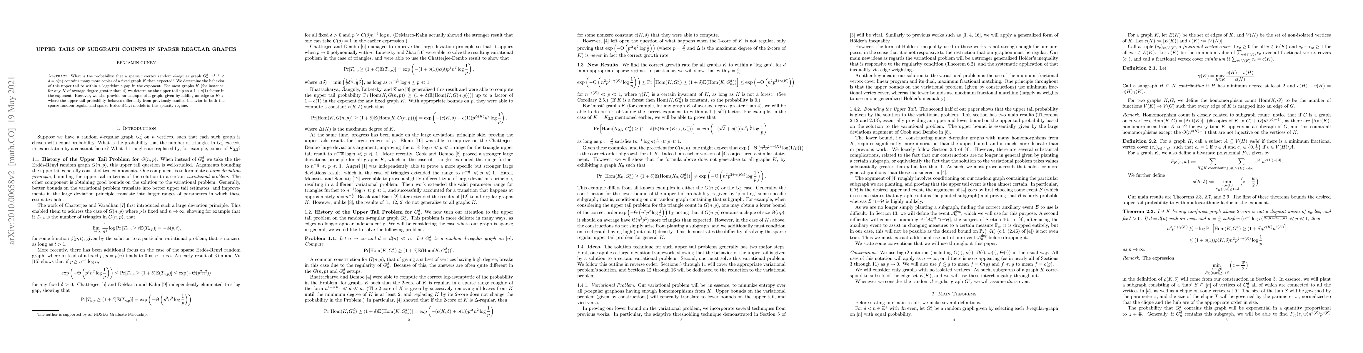 This paper investigates the probability of a sparse $n$-vertex random $d$-regular graph containing significantly more copies of a fixed graph $K$ than expected, determining the upper tail behavior up to a logarithmic gap. For most graphs $K$, the upper tail is determined up to a $1+o(1)$ factor, but an exception is noted for a specific graph derived from $K_{2,4}$.