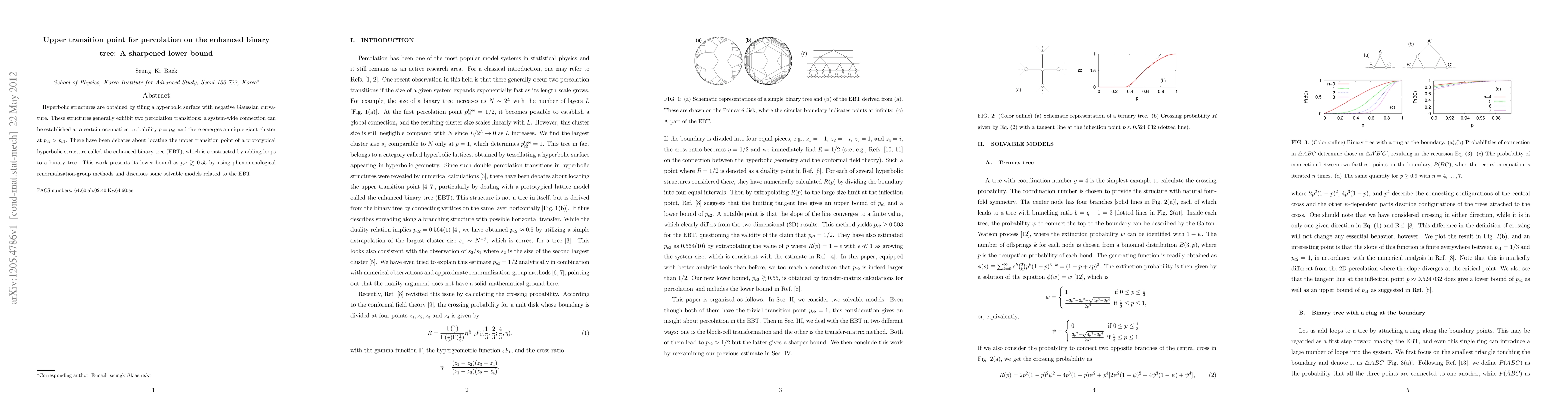 This paper establishes a lower bound of $p_{c2} \gtrsim 0.55$ for the upper percolation transition point on the enhanced binary tree (EBT), a hyperbolic structure, using phenomenological renormalization-group methods. It also explores related solvable models and contributes to the ongoing debate on percolation transitions in hyperbolic structures.