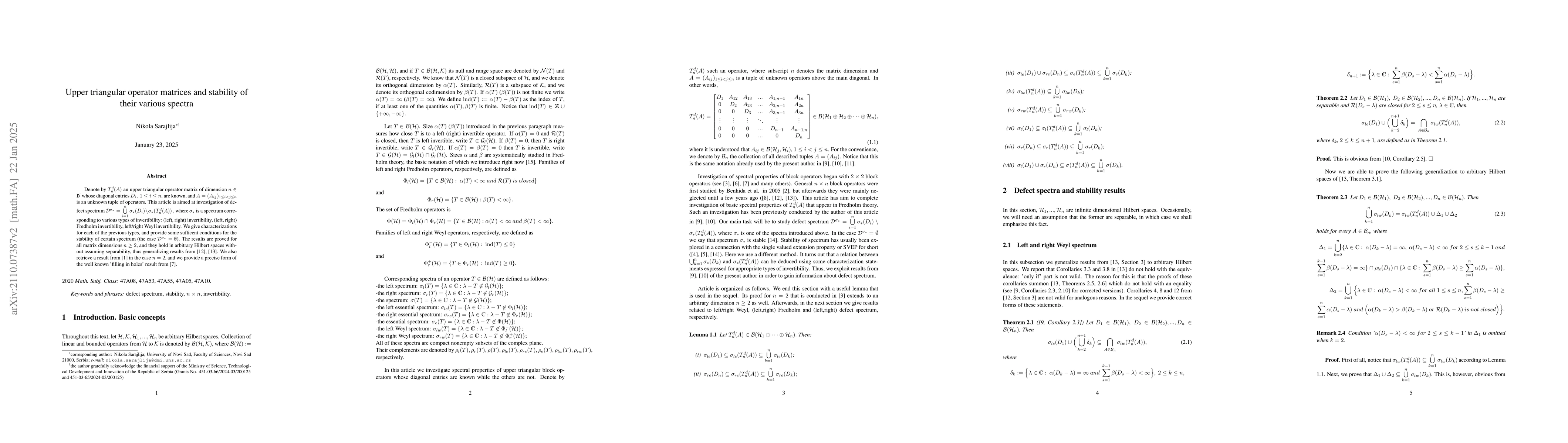 This research investigates upper triangular operator matrices, focusing on the stability of their various spectra under different types of invertibility. It provides characterizations and sufficient conditions for when the defect spectrum is empty, generalizing previous results for arbitrary dimensions and spaces without separability assumptions. The study builds upon previous work exploring invertibility properties in Fredholm theory.