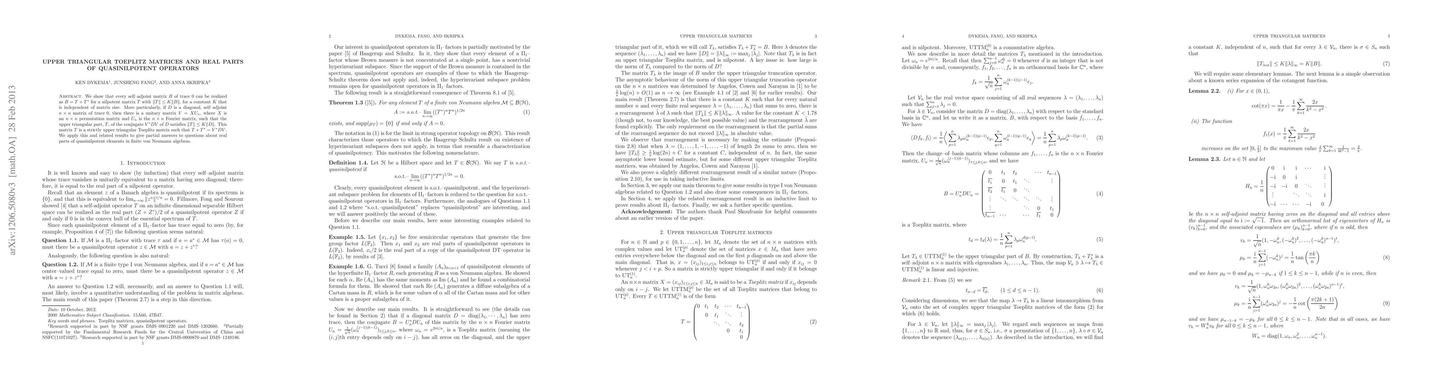 This paper demonstrates that any self-adjoint matrix B of trace 0 can be expressed as the sum of a nilpotent matrix T and its conjugate, with T's norm bounded by a constant K times the norm of B. It also constructs a unitary matrix V to show that the upper triangular part of V^*DV is a strictly upper triangular Toeplitz matrix, relevant to understanding quasinilpotent elements in finite von Neumann algebras.