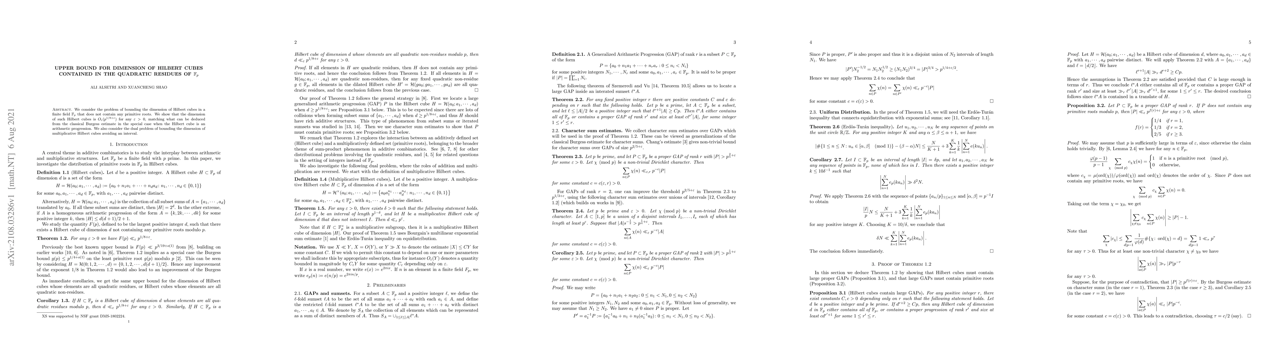 Summary: This paper establishes an upper bound of $O_{\epsilon}(p^{1/8+\epsilon})$ for the dimension of Hilbert cubes within quadratic residues of $\mathbb{F_p}$, without primitive roots, and matches this result to the Burgess estimate for arithmetic progressions. It also explores the dual problem of multiplicative Hilbert cubes avoiding intervals.