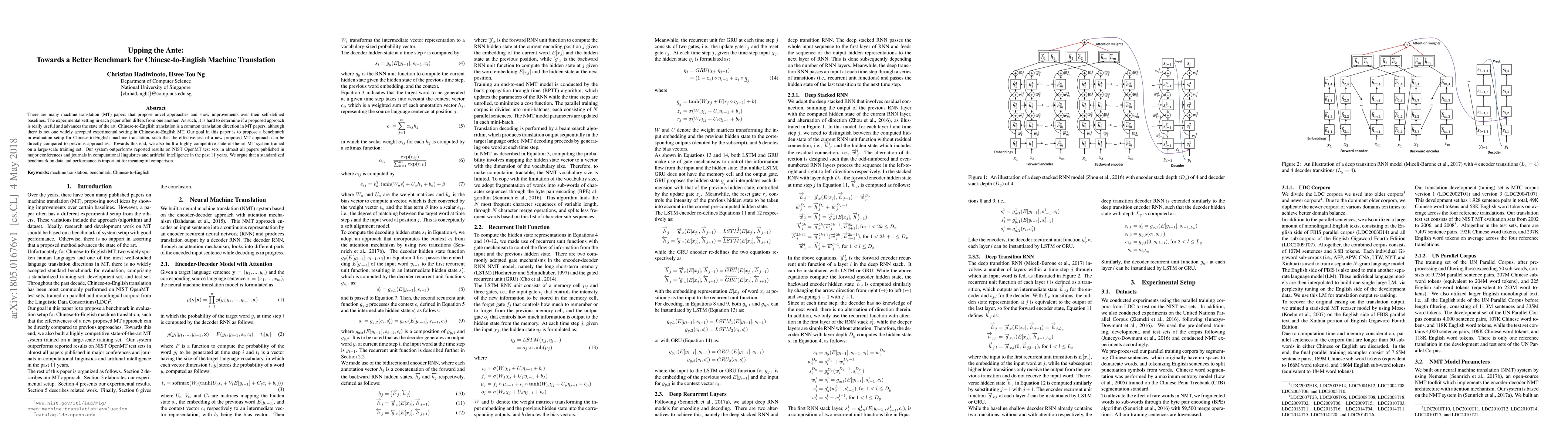 This paper aims to establish a standardized benchmark for Chinese-to-English machine translation, proposing a consistent evaluation setup to compare new approaches against previous results. The authors also developed a competitive state-of-the-art MT system that outperforms existing methods on NIST OpenMT test sets.