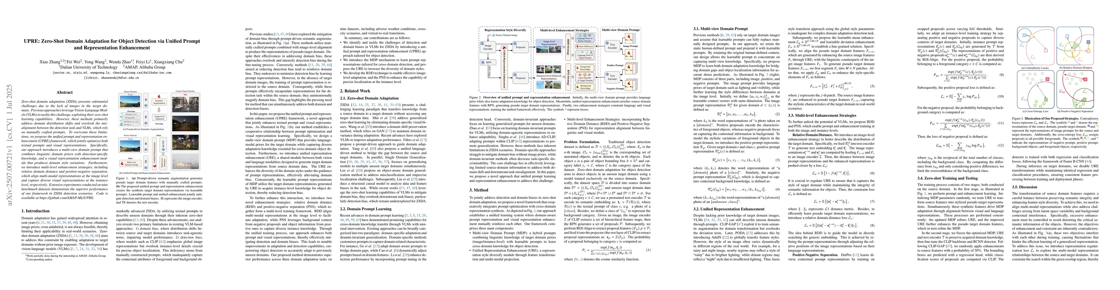 Zero-shot domain adaptation (ZSDA) presents substantial challenges due to the lack of images in the target domain. Previous approaches leverage Vision-Language Models (VLMs) to tackle this challenge, exploiting their zero-shot learning capabilities. However, these methods primarily address domain distribution shifts and overlook the misalignment between the detection task and VLMs, which rely on manually crafted prompts. To overcome these limitations, we propose the unified prompt and representation enhancement (UPRE) framework, which jointly optimizes both textual prompts and visual representations. Specifically, our approach introduces a multi-view domain prompt that combines linguistic domain priors with detection-specific knowledge, and a visual representation enhancement module that produces domain style variations. Furthermore, we introduce multi-level enhancement strategies, including relative domain distance and positive-negative separation, which align multi-modal representations at the image level and capture diverse visual representations at the instance level, respectively. Extensive experiments conducted on nine benchmark datasets demonstrate the superior performance of our framework in ZSDA detection scenarios. Code is available at https://github.com/AMAP-ML/UPRE.