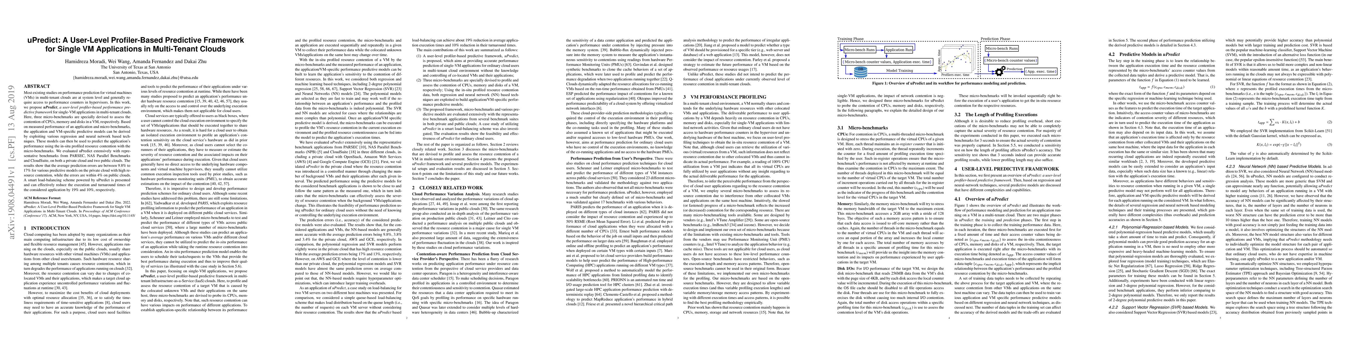 uPredict is a user-level profiler-based framework for predicting performance of single VM applications in multi-tenant clouds, using micro-benchmarks to assess CPU, memory, and disk contention. It employs regression and neural network techniques to derive predictive models, achieving prediction errors between 9.8% to 17% in private clouds and within 4% in public clouds, and enabling a smart load-balancing scheme to reduce execution and turnaround times by 19% and 10%, respectively.