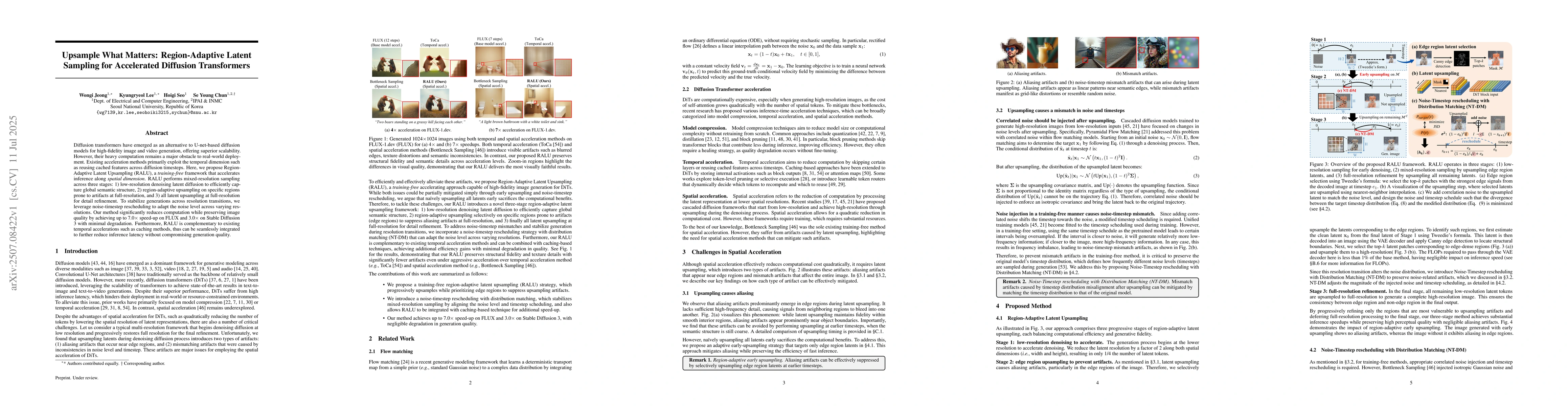 Diffusion transformers have emerged as an alternative to U-net-based diffusion models for high-fidelity image and video generation, offering superior scalability. However, their heavy computation remains a major obstacle to real-world deployment. Existing acceleration methods primarily exploit the temporal dimension such as reusing cached features across diffusion timesteps. Here, we propose Region-Adaptive Latent Upsampling (RALU), a training-free framework that accelerates inference along spatial dimension. RALU performs mixed-resolution sampling across three stages: 1) low-resolution denoising latent diffusion to efficiently capture global semantic structure, 2) region-adaptive upsampling on specific regions prone to artifacts at full-resolution, and 3) all latent upsampling at full-resolution for detail refinement. To stabilize generations across resolution transitions, we leverage noise-timestep rescheduling to adapt the noise level across varying resolutions. Our method significantly reduces computation while preserving image quality by achieving up to 7.0$\times$ speed-up on FLUX and 3.0$\times$ on Stable Diffusion 3 with minimal degradation. Furthermore, RALU is complementary to existing temporal accelerations such as caching methods, thus can be seamlessly integrated to further reduce inference latency without compromising generation quality.