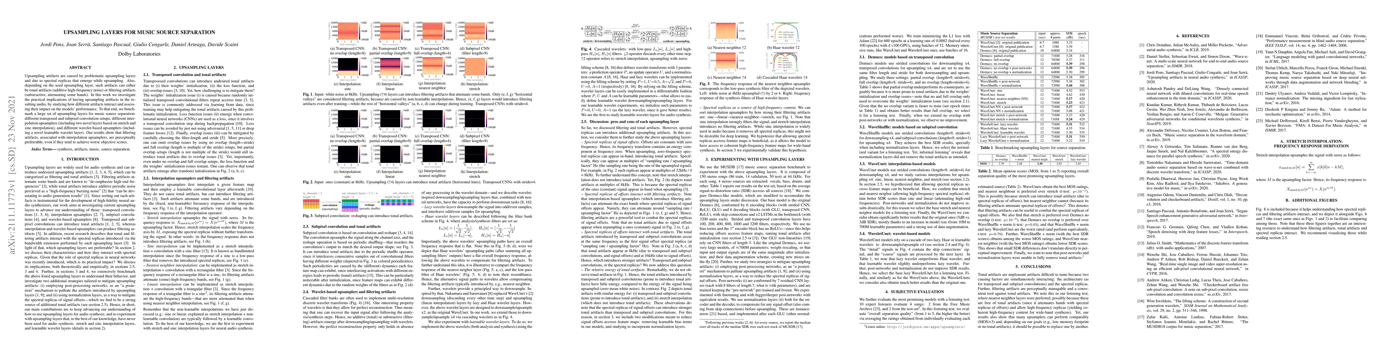 Upsampling artifacts are caused by problematic upsampling layers and due to spectral replicas that emerge while upsampling. Also, depending on the used upsampling layer, such artifacts can either be tonal artifacts (additive high-frequency noise) or filtering artifacts (substractive, attenuating some bands). In this work we investigate the practical implications of having upsampling artifacts in the resulting audio, by studying how different artifacts interact and assessing their impact on the models' performance. To that end, we benchmark a large set of upsampling layers for music source separation: different transposed and subpixel convolution setups, different interpolation upsamplers (including two novel layers based on stretch and sinc interpolation), and different wavelet-based upsamplers (including a novel learnable wavelet layer). Our results show that filtering artifacts, associated with interpolation upsamplers, are perceptually preferrable, even if they tend to achieve worse objective scores.