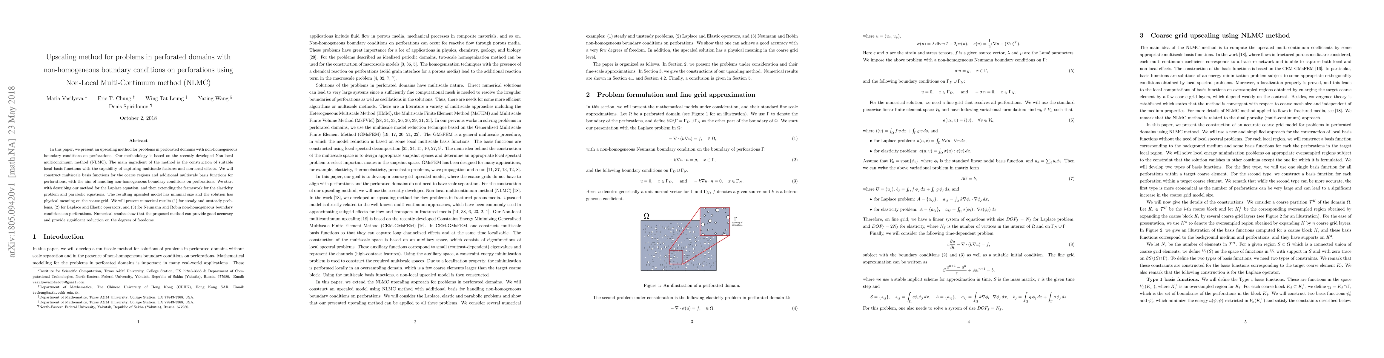 In this paper, we present an upscaling method for problems in perforated domains with non-homogeneous boundary conditions on perforations. Our methodology is based on the recently developed Non-local multicontinuum method (NLMC). The main ingredient of the method is the construction of suitable local basis functions with the capability of capturing multiscale features and non-local effects. We will construct multiscale basis functions for the coarse regions and additional multiscale basis functions for perforations, with the aim of handling non-homogeneous boundary conditions on perforations. We start with describing our method for the Laplace equation, and then extending the framework for the elasticity problem and parabolic equations. The resulting upscaled model has minimal size and the solution has physical meaning on the coarse grid. We will present numerical results (1) for steady and unsteady problems, (2) for Laplace and Elastic operators, and (3) for Neumann and Robin non-homogeneous boundary conditions on perforations. Numerical results show that the proposed method can provide good accuracy and provide significant reduction on the degrees of freedom.