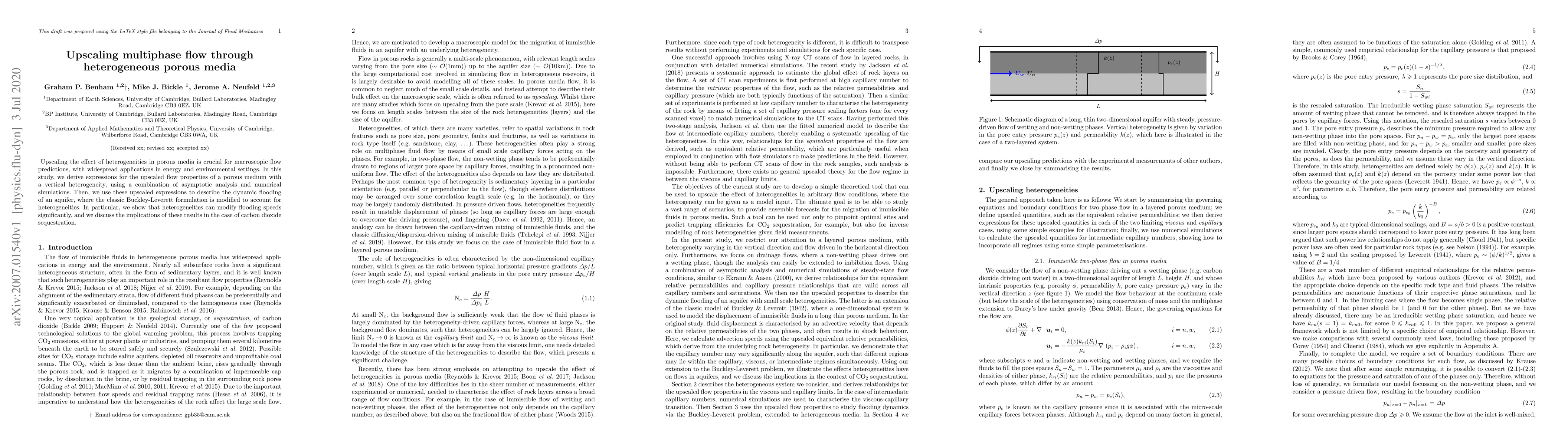 This paper derives upscaled flow properties for heterogeneous porous media using asymptotic analysis and simulations, and modifies the Buckley-Leverett model to account for heterogeneities, showing significant impacts on flooding speeds with implications for carbon dioxide sequestration.