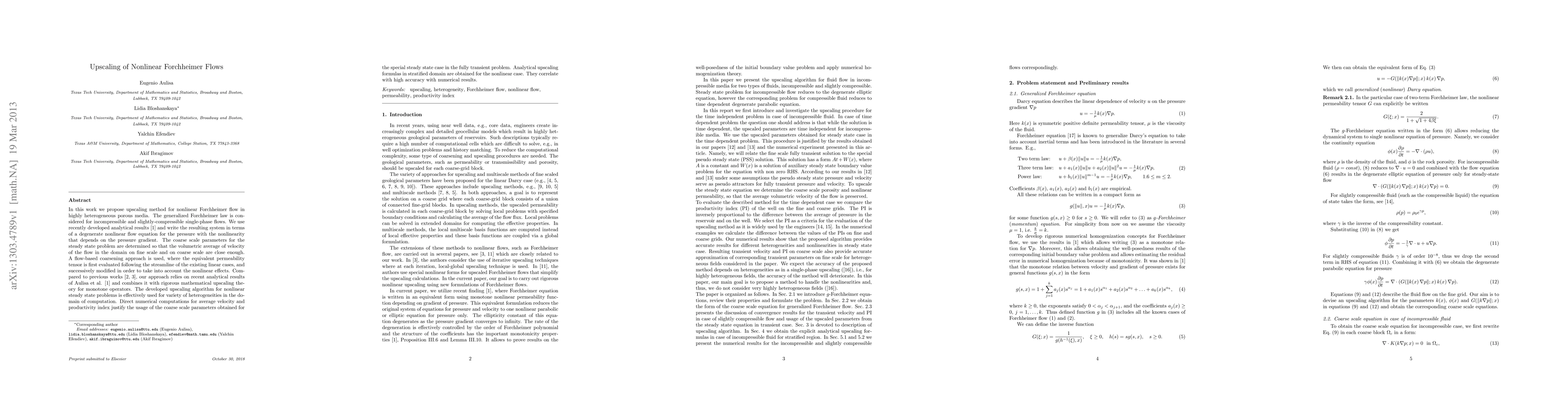 In this work we propose upscaling method for nonlinear Forchheimer flow in highly heterogeneous porous media. The generalized Forchheimer law is considered for incompressible and slightly-compressible single-phase flows. We use recently developed analytical results Aulisa et al. (2009) and write the resulting system in terms of a degenerate nonlinear flow equation for the pressure with the nonlinearity that depends on the pressure gradient. The coarse scale parameters for the steady state problem are determined so that the volumetric average of velocity of the flow in the domain on fine scale and on coarse scale are close enough. A flow-based coarsening approach is used, where the equivalent permeability tensor is first evaluated following the streamline of the existing linear cases, and successively modified in order to take into account the nonlinear effects. Compared to previous works Durlofsky and Karimi-Fard (2009) and Peszynska et al. (2009), our approach relies on recent analytical results of Aulisa et al. (2009) and combines it with rigorous mathematical upscaling theory for monotone operators. The developed upscaling algorithm for nonlinear steady state problems is effectively used for variety of heterogeneities in the domain of computation. Direct numerical computations for average velocity and productivity index justify the usage of the coarse scale parameters obtained for the special steady state case in the fully transient problem. Analytical upscaling formulas in stratified domain are obtained for the nonlinear case. They correlate with high accuracy with numerical results.