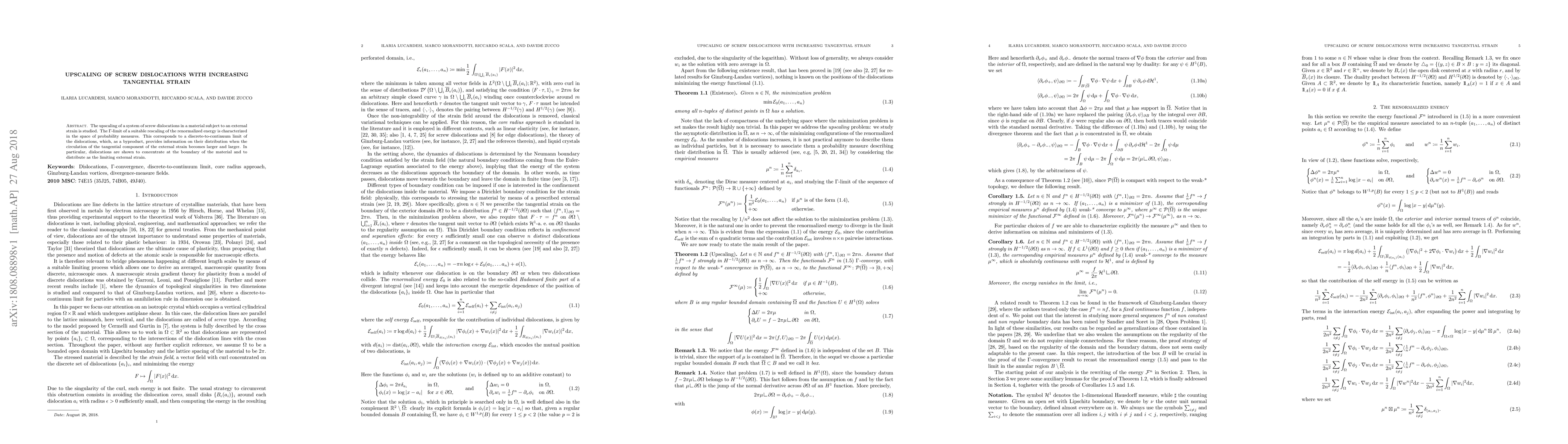 This paper investigates the upscaling of screw dislocations in materials under increasing tangential strain, demonstrating that dislocations concentrate at the material boundary and their distribution aligns with the limiting external strain, characterized through the $\Gamma$-limit of renormalized energy in the space of probability measures.