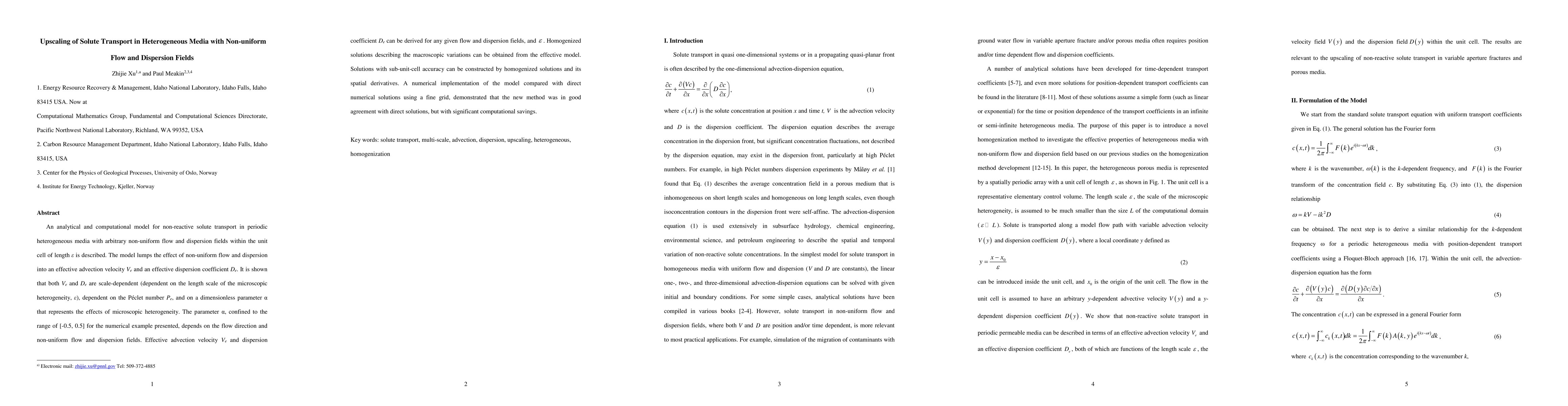 An analytical and computational model for non-reactive solute transport in periodic heterogeneous media with arbitrary non-uniform flow and dispersion fields within the unit cell of length {\epsilon} is described. The model lumps the effect of non-uniform flow and dispersion into an effective advection velocity Ve and an effective dispersion coefficient De. It is shown that both Ve and De are scale-dependent (dependent on the length scale of the microscopic heterogeneity, {\epsilon}), dependent on the P\'eclet number Pe, and on a dimensionless parameter {\alpha} that represents the effects of microscopic heterogeneity. The parameter {\alpha}, confined to the range of [-0.5, 0.5] for the numerical example presented, depends on the flow direction and non-uniform flow and dispersion fields. Effective advection velocity Ve and dispersion coefficient De can be derived for any given flow and dispersion fields, and {\epsilon}. Homogenized solutions describing the macroscopic variations can be obtained from the effective model. Solutions with sub-unit-cell accuracy can be constructed by homogenized solutions and its spatial derivatives. A numerical implementation of the model compared with direct numerical solutions using a fine grid, demonstrated that the new method was in good agreement with direct solutions, but with significant computational savings.