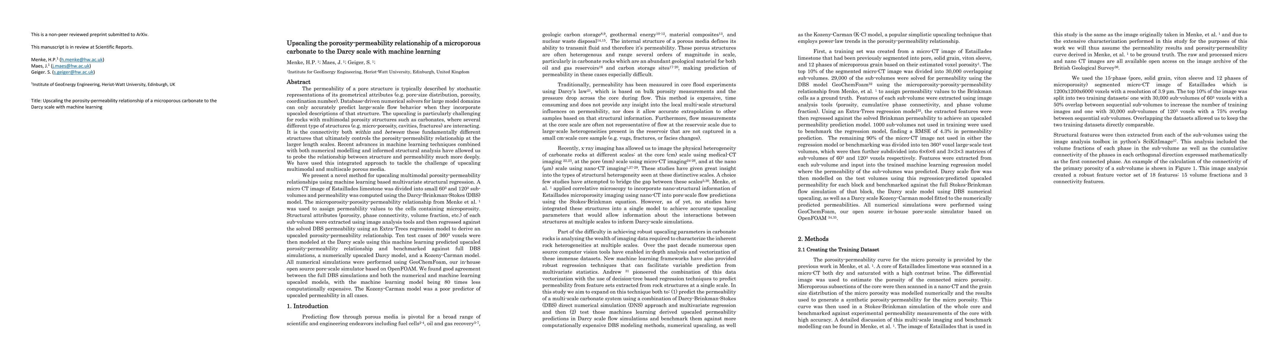 This paper presents a novel machine learning method for upscaling the porosity-permeability relationship in microporous carbonates to the Darcy scale. The authors use multivariate structural regression to derive an upscaled relationship from micro-CT images and benchmark it against full numerical simulations, showing good agreement.