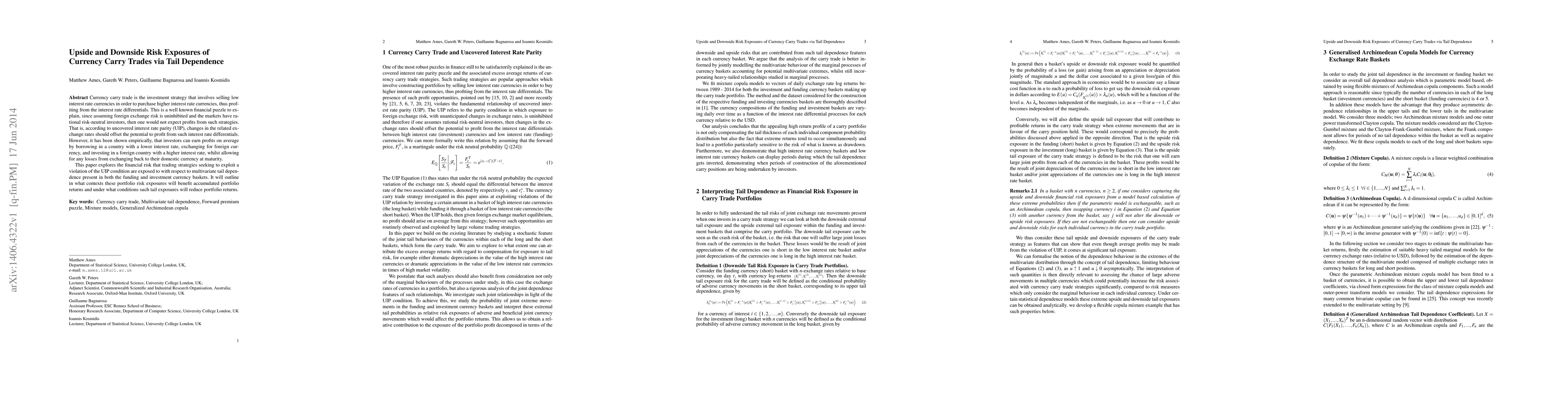 Currency carry trade is the investment strategy that involves selling low interest rate currencies in order to purchase higher interest rate currencies, thus profiting from the interest rate differentials. This is a well known financial puzzle to explain, since assuming foreign exchange risk is uninhibited and the markets have rational risk-neutral investors, then one would not expect profits from such strategies. That is, according to uncovered interest rate parity (UIP), changes in the related exchange rates should offset the potential to profit from such interest rate differentials. However, it has been shown empirically, that investors can earn profits on average by borrowing in a country with a lower interest rate, exchanging for foreign currency, and investing in a foreign country with a higher interest rate, whilst allowing for any losses from exchanging back to their domestic currency at maturity. This paper explores the financial risk that trading strategies seeking to exploit a violation of the UIP condition are exposed to with respect to multivariate tail dependence present in both the funding and investment currency baskets. It will outline in what contexts these portfolio risk exposures will benefit accumulated portfolio returns and under what conditions such tail exposures will reduce portfolio returns.