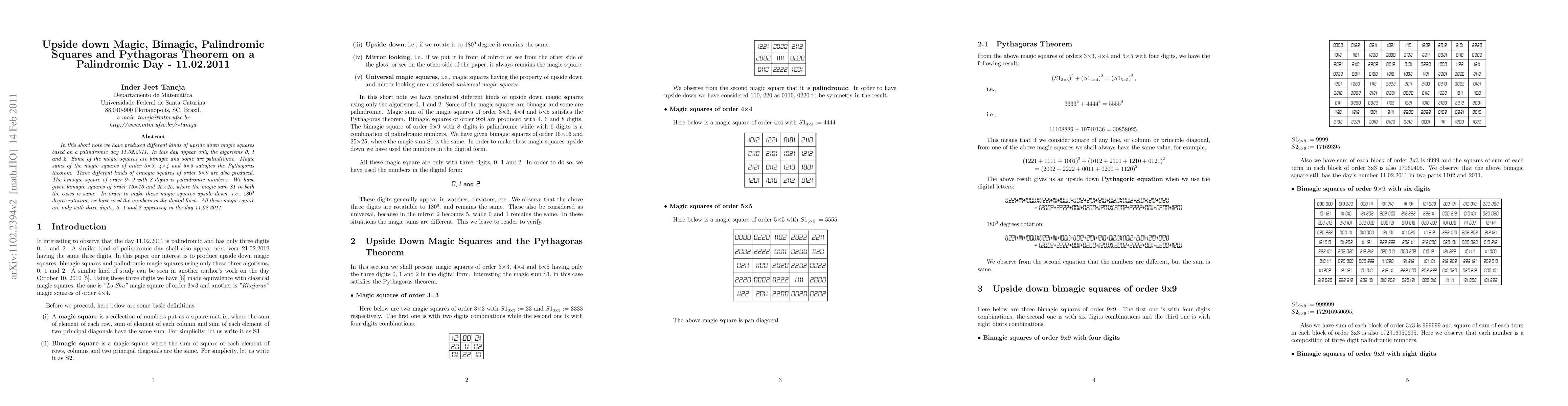 This paper explores various types of upside-down magic squares based on the palindromic date 11.02.2011, featuring only the digits 0, 1, and 2. It presents bimagic and palindromic squares, including a 9x9 bimagic square with palindromic 8-digit numbers, and demonstrates that their magic sums satisfy the Pythagorean theorem.