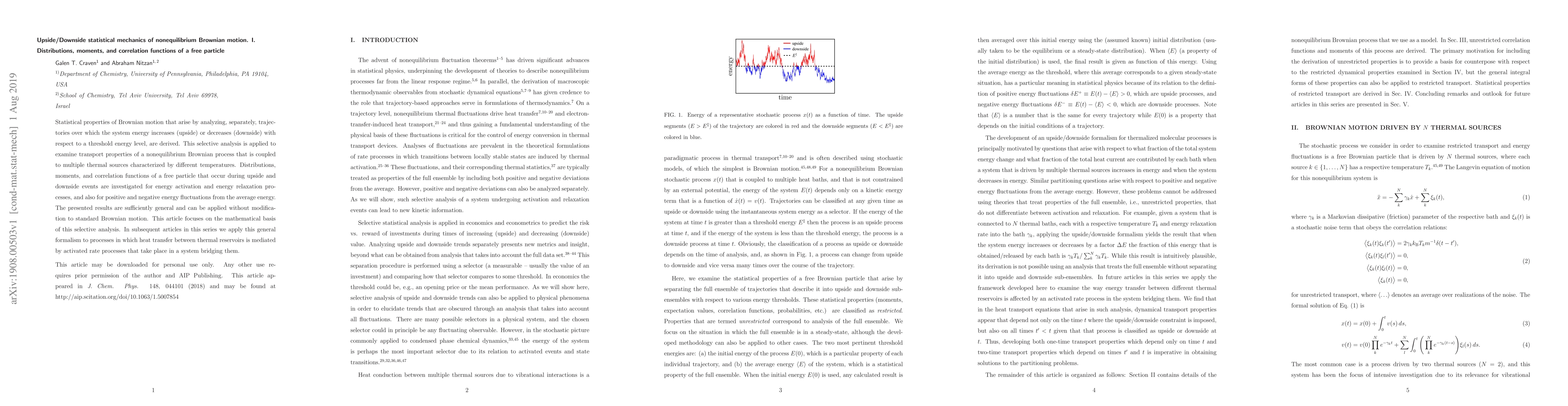Statistical properties of Brownian motion that arise by analyzing, separately, trajectories over which the system energy increases (upside) or decreases (downside) with respect to a threshold energy level, are derived. This selective analysis is applied to examine transport properties of a nonequilibrium Brownian process that is coupled to multiple thermal sources characterized by different temperatures. Distributions, moments, and correlation functions of a free particle that occur during upside and downside events are investigated for energy activation and energy relaxation processes, and also for positive and negative energy fluctuations from the average energy. The presented results are sufficiently general and can be applied without modification to standard Brownian motion. This article focuses on the mathematical basis of this selective analysis. In subsequent articles in this series we apply this general formalism to processes in which heat transfer between thermal reservoirs is mediated by activated rate processes that take place in a system bridging them.