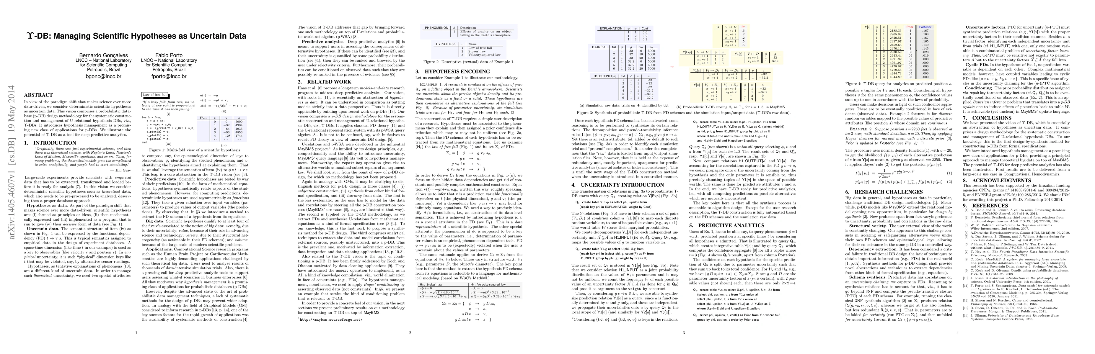 In view of the paradigm shift that makes science ever more data-driven, we consider deterministic scientific hypotheses as uncertain data. This vision comprises a probabilistic database (p-DB) design methodology for the systematic construction and management of U-relational hypothesis DBs, viz., $\Upsilon$-DBs. It introduces hypothesis management as a promising new class of applications for p-DBs. We illustrate the potential of $\Upsilon$-DB as a tool for deep predictive analytics.