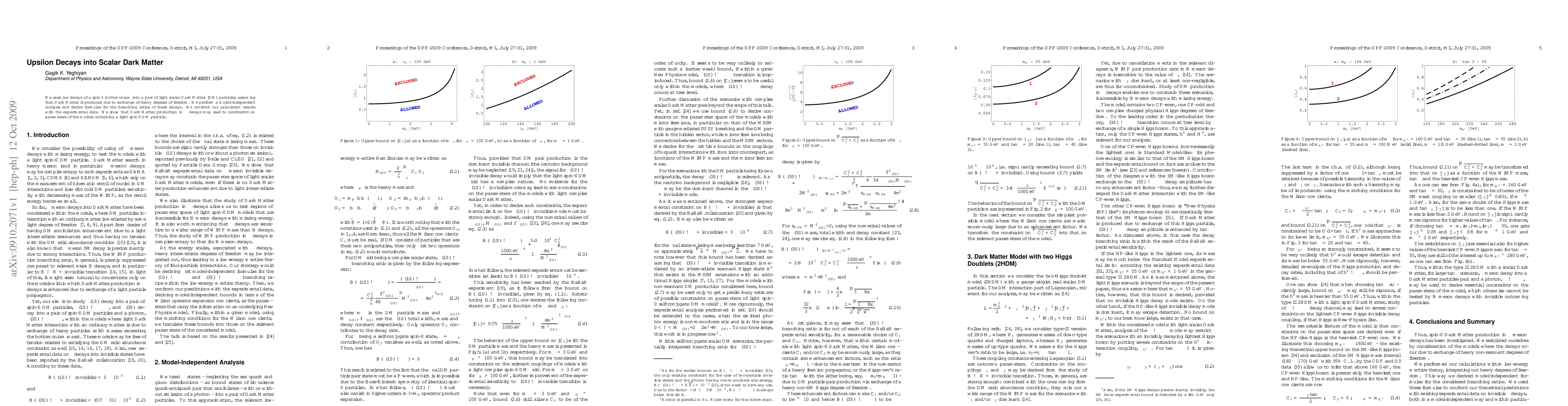 The study examines decays of a spin-1 bottomonium (Upsilon) into a pair of light scalar Dark Matter particles, using a model-independent analysis to derive formulae for branching ratios and comparing these with experimental data.