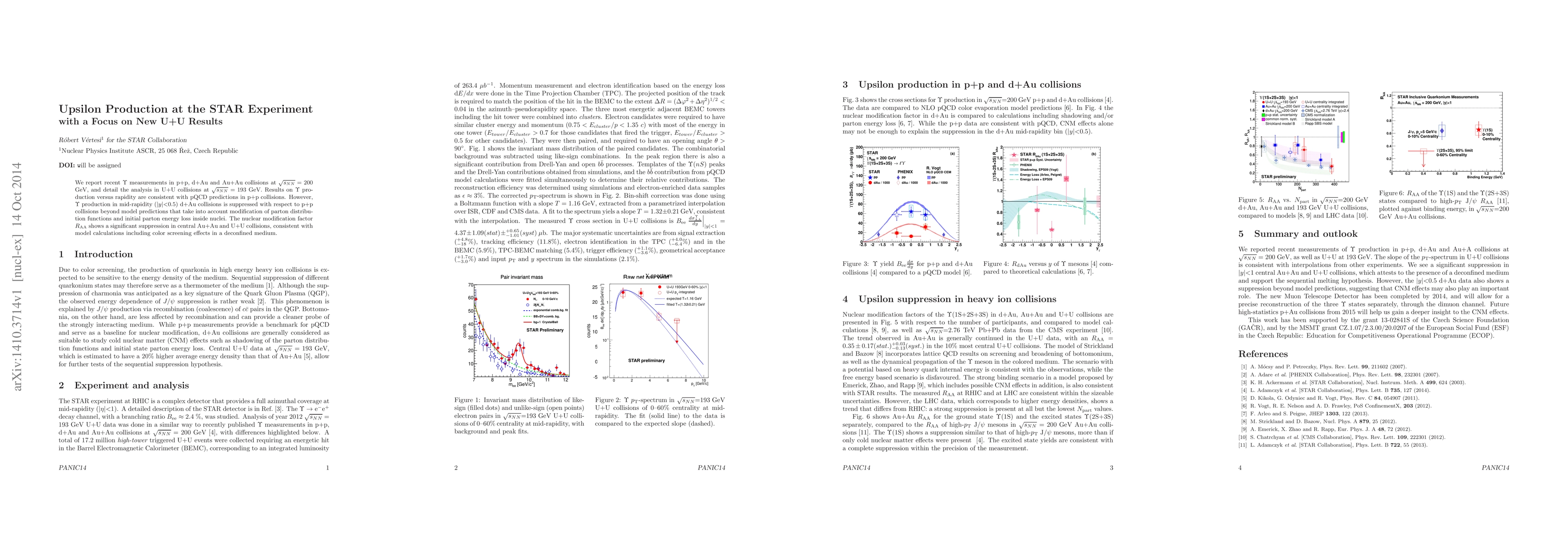 We report recent Upsilon measurements in p+p, d+Au and Au+Au collisions at $\sqrt{s_{NN}}$=200 GeV, and detail the analysis in U+U collisions at $\sqrt{s_{NN}}$=193 GeV. Results on Upsilon production versus rapidity are consistent with pQCD predictions in p+p collisions. However, Upsilon production in mid-rapidity (|y|<0.5) d+Au collisions is suppressed with respect to p+p collisions beyond model predictions that take into account modification of parton distribution functions and initial parton energy loss inside nuclei. The nuclear modification factor R_AA shows a significant suppression in central Au+Au and U+U collisions, consistent with model calculations including color screening effects in a deconfined medium.