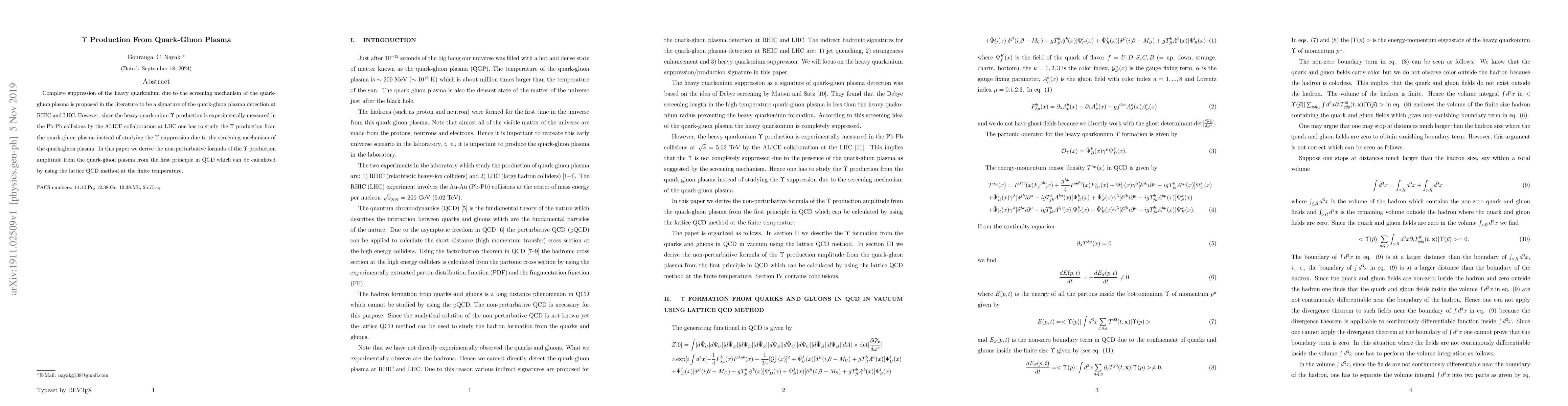 Complete suppression of the heavy quarkonium due to the screening mechanism of the quark-gluon plasma is proposed in the literature to be a signature of the quark-gluon plasma detection at RHIC and LHC. However, since the heavy quarkonium $\Upsilon$ production is experimentally measured in the Pb-Pb collisions by the ALICE collaboration at LHC one has to study the $\Upsilon$ production from the quark-gluon plasma instead of studying the $\Upsilon$ suppression due to the screening mechanism of the quark-gluon plasma. In this paper we derive the non-perturbative formula of the $\Upsilon$ production amplitude from the quark-gluon plasma from the first principle in QCD which can be calculated by using the lattice QCD method at the finite temperature.