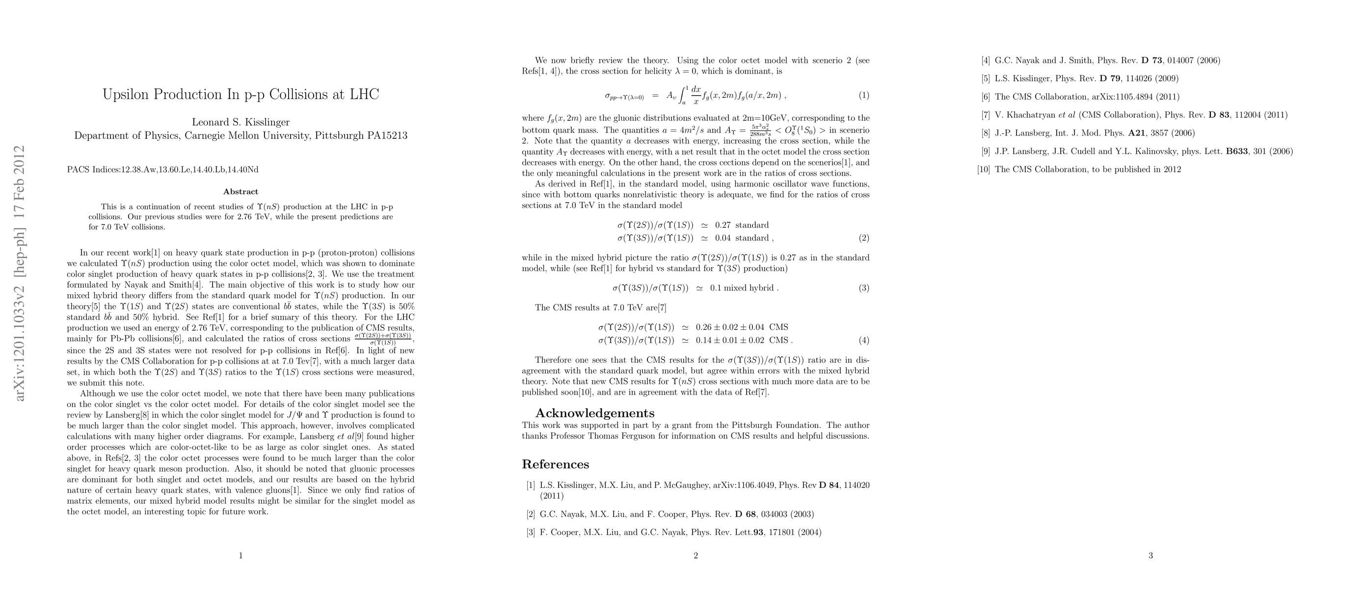 This is a continuation of recent studies of $\Upsilon(nS)$ production at the LHC in p-p collisions. Our previous studies were for 2.76 TeV, while the present predictions are for 7.0 TeV collisions.