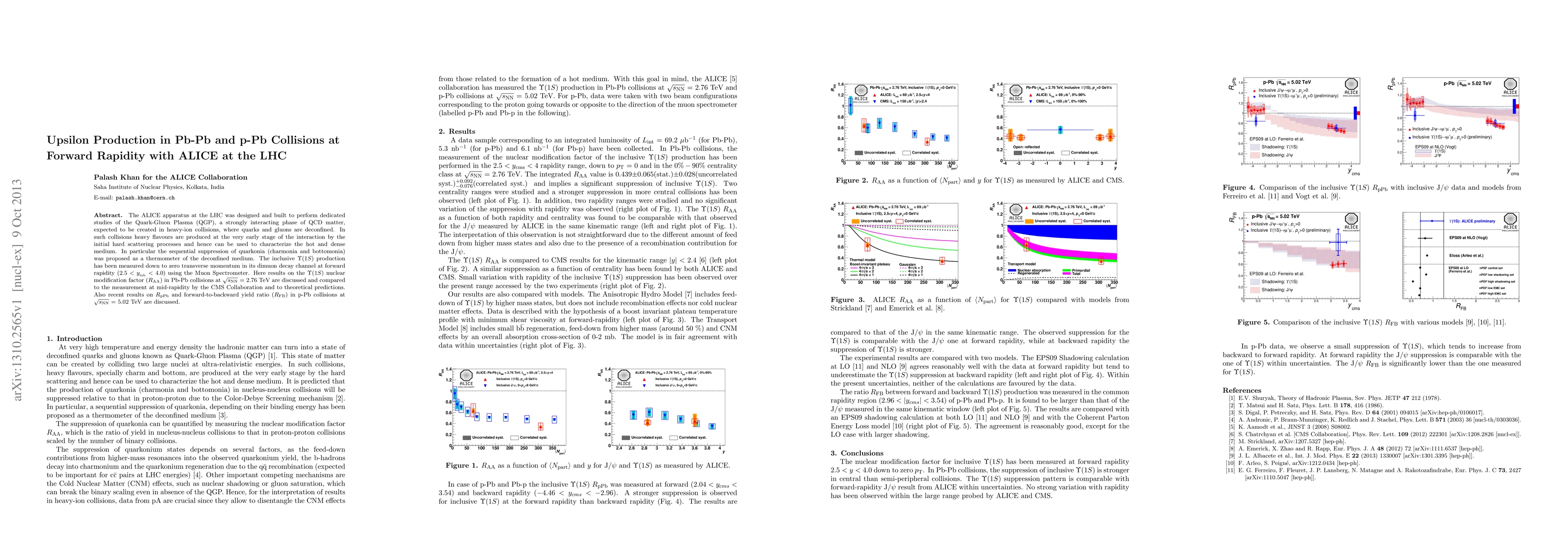 The ALICE experiment at the LHC measured the inclusive $\Upsilon(1S)$ production in Pb-Pb and p-Pb collisions, analyzing its nuclear modification factor and comparing it to CMS results and theoretical predictions to study the Quark-Gluon Plasma. Recent findings on the forward-to-backward yield ratio in p-Pb collisions provide further insights into the properties of the hot and dense medium.