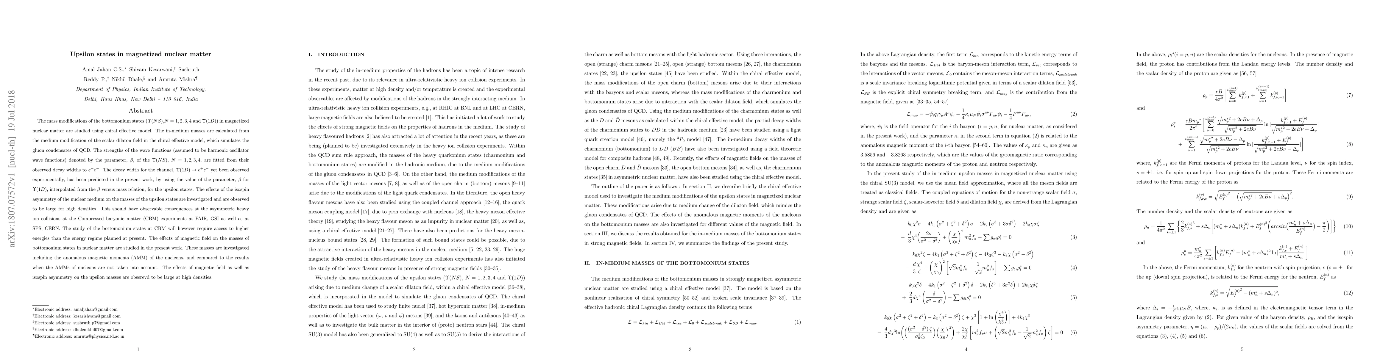 The mass modifications of the bottomonium states ($\Upsilon (NS)$,$N=1,2,3,4$ and $\Upsilon (1D)$) in magnetized nuclear matter are studied using chiral effective model. The in-medium masses are calculated from the medium modification of the scalar dilaton field in the chiral effective model, which simulates the gluon condensates of QCD. The strengths of the wave functions (assumed to be harmonic oscillator wave functions) denoted by the parameter, $\beta$, of the $\Upsilon (NS)$, $N=1,2,3,4$, are fitted from their observed decay widths to $e^+e^-$. The decay width for the channel, $\Upsilon (1D) \rightarrow e^+ e^-$ %, which has not yet been observed experimentally, has been predicted in the present work, by using the value of the parameter, $\beta$ for $\Upsilon(1D)$, interpolated from the $\beta$ versus mass relation, for the upsilon states. The effects of the isospin asymmetry of the nuclear medium on the masses of the upsilon states are investigated and are observed to be large for high densities. This should have observable consequences at the asymmetric heavy ion collisions at the Compressed baryonic matter (CBM) experiments at FAIR, GSI as well as at SPS, CERN. The study of the bottomonium states at CBM will however require access to higher energies than the energy regime planned at present. The effects of magnetic field on the masses of bottomonium states in nuclear matter are studied in the present work. These masses are investigated including the anomalous magnetic moments (AMM) of the nucleons, and compared to the results when the AMMs of nucleons are not taken into account. The effects of magnetic field as well as isospin asymmetry on the upsilon masses are obserevd to be large at high densities.