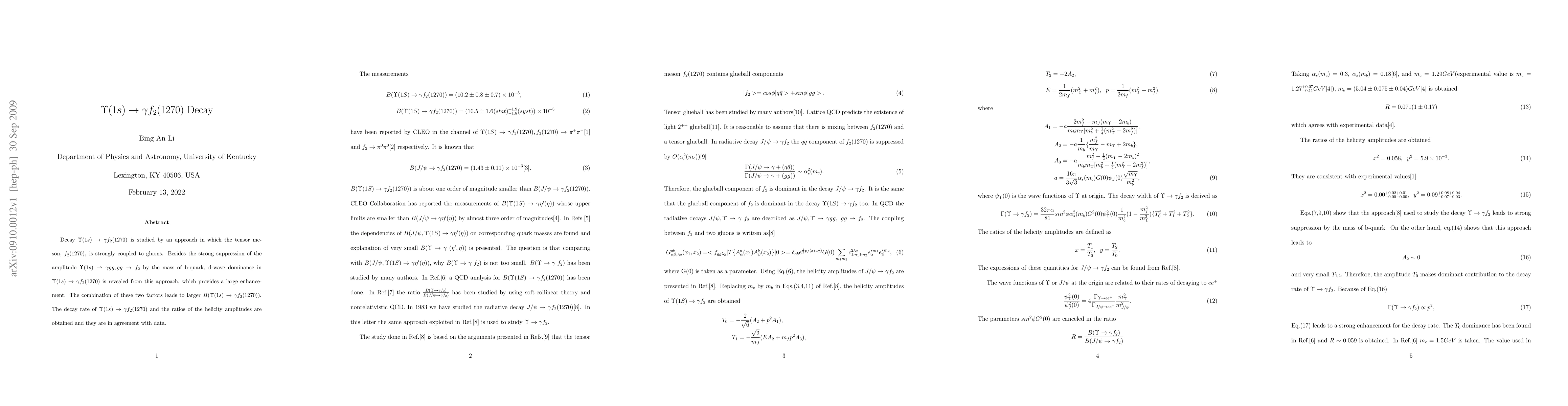 This study investigates the decay $\Upsilon(1s)\to\gamma f_2(1270)$ using a model where $f_2(1270)$ is strongly coupled to gluons, revealing d-wave dominance and a large enhancement due to the suppression of the $b$-quark mass. The calculated decay rate and helicity amplitudes align with experimental data.