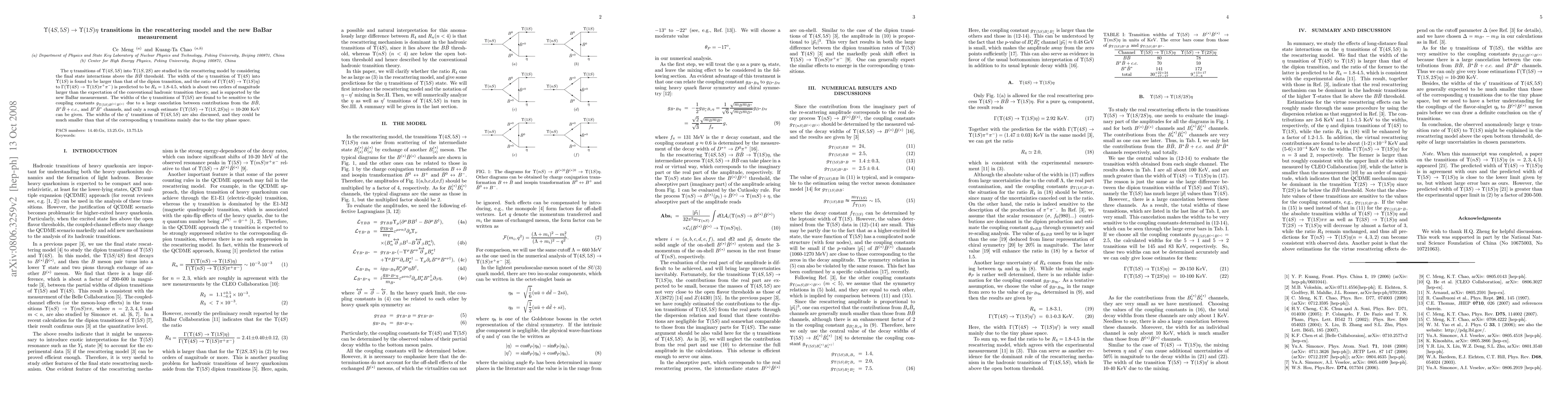 This paper investigates $\Upsilon(4S,5S)$ to $\Upsilon(1S)\eta$ transitions using a rescattering model, finding the transition width for $\Upsilon(4S)$ to $\Upsilon(1S)\eta$ significantly larger than for the dipion transition. The predicted ratio $R_4$ is about two orders of magnitude greater than conventional theory and aligns with new BaBar measurements. The $\Upsilon(5S)$ transitions are highly sensitive to coupling constants.