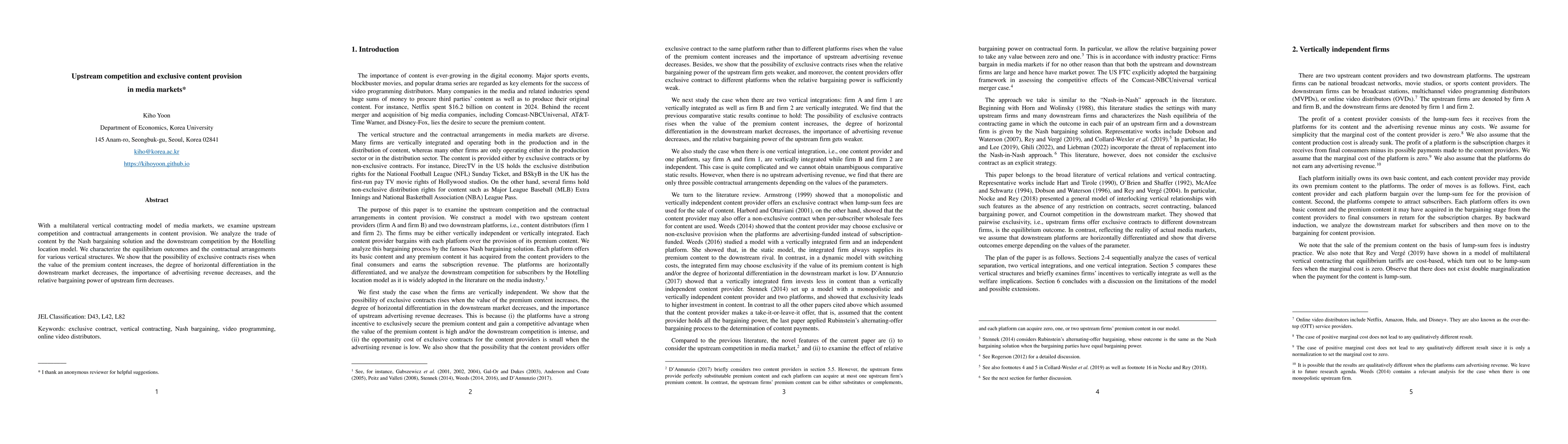 With a multilateral vertical contracting model of media markets, we examine upstream competition and contractual arrangements in content provision. We analyze the trade of content by the Nash bargaining solution and the downstream competition by the Hotelling location model. We characterize the equilibrium outcomes and the contractual arrangements for various vertical structures. We show that the possibility of exclusive contracts rises when the value of the premium content increases, the degree of horizontal differentiation in the downstream market decreases, the importance of advertising revenue decreases, and the relative bargaining power of upstream firm decreases.