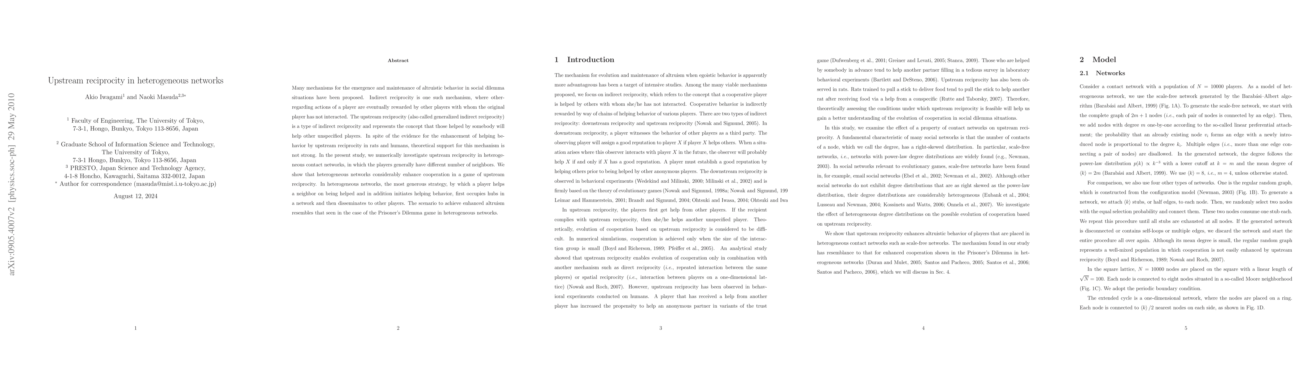 This study numerically investigates upstream reciprocity in heterogeneous networks, showing that such networks significantly enhance cooperation compared to homogeneous ones. The most generous strategy spreads first through hubs and then disseminates to other players, resembling dynamics seen in the Prisoner's Dilemma.