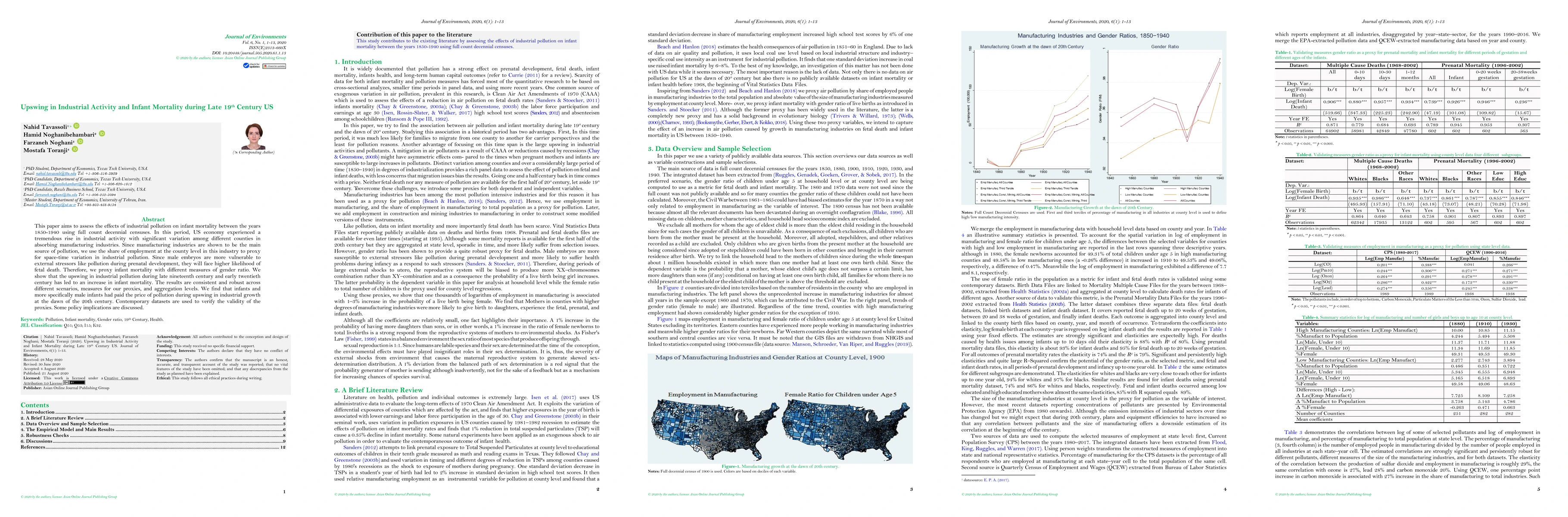 This paper aims to assess the effects of industrial pollution on infant mortality between the years 1850-1940 using full count decennial censuses. In this period, US economy experienced a tremendous rise in industrial activity with significant variation among different counties in absorbing manufacturing industries. Since manufacturing industries are shown to be the main source of pollution, we use the share of employment at the county level in this industry to proxy for space-time variation in industrial pollution. Since male embryos are more vulnerable to external stressors like pollution during prenatal development, they will face higher likelihood of fetal death. Therefore, we proxy infant mortality with different measures of gender ratio. We show that the upswing in industrial pollution during late nineteenth century and early twentieth century has led to an increase in infant mortality. The results are consistent and robust across different scenarios, measures for our proxies, and aggregation levels. We find that infants and more specifically male infants had paid the price of pollution during upswing in industrial growth at the dawn of the 20th century. Contemporary datasets are used to verify the validity of the proxies. Some policy implications are discussed.
