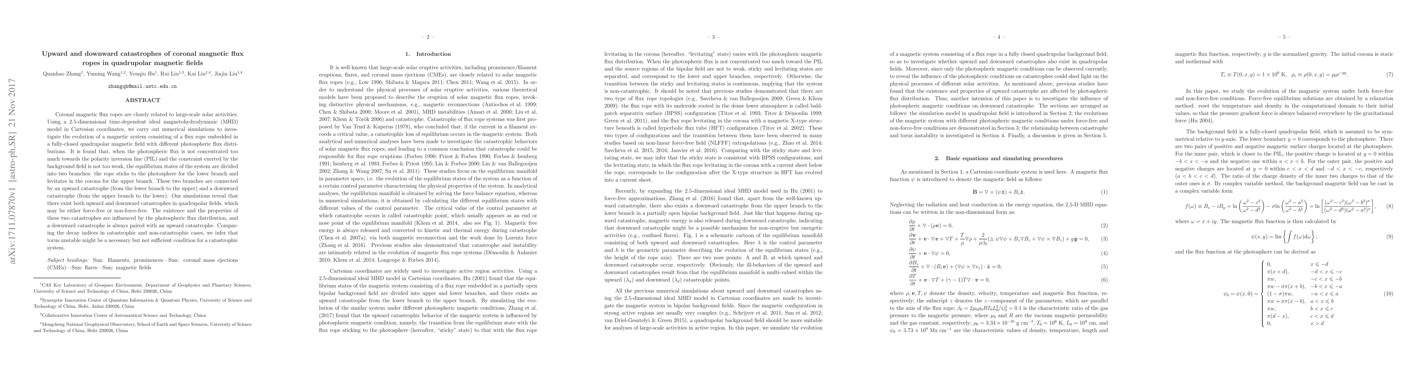 This paper investigates the evolution of coronal magnetic flux ropes in quadrupolar magnetic fields using 2.5D MHD simulations, revealing two equilibrium branches connected by upward and downward catastrophes. The study finds that these catastrophes are influenced by photospheric flux distribution and suggest that torus instability is a necessary but not sufficient condition for catastrophic behavior.