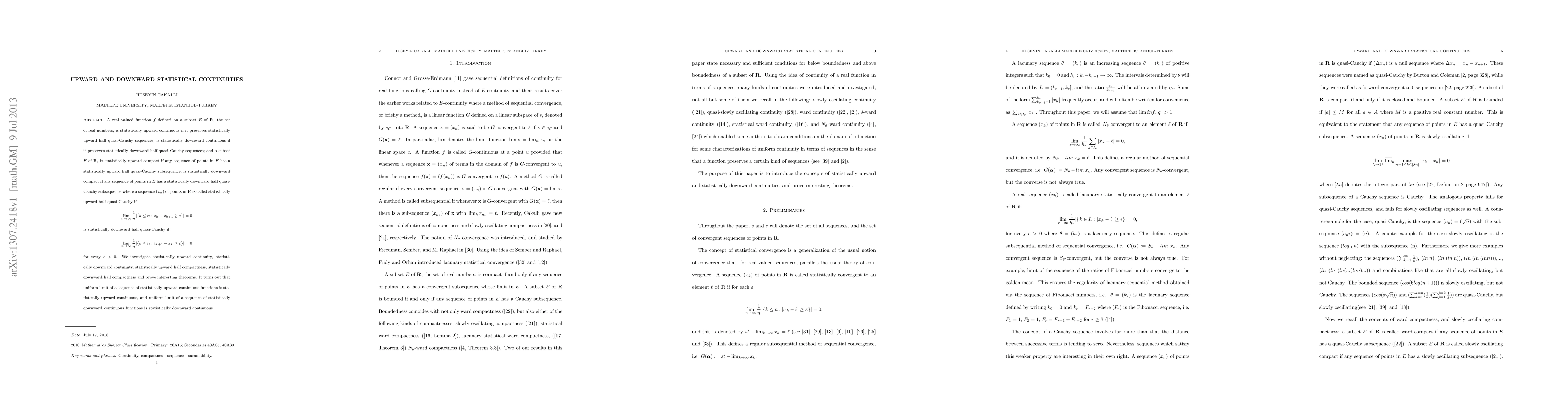 A real valued function $f$ defined on a subset $E$ of $\textbf{R}$, the set of real numbers, is statistically upward continuous if it preserves statistically upward half quasi-Cauchy sequences, is statistically downward continuous if it preserves statistically downward half quasi-Cauchy sequences; and a subset $E$ of $\textbf{R}$, is statistically upward compact if any sequence of points in $E$ has a statistically upward half quasi-Cauchy subsequence, is statistically downward compact if any sequence of points in $E$ has a statistically downward half quasi-Cauchy subsequence where a sequence $(x_{n})$ of points in $\textbf{R}$ is called statistically upward half quasi-Cauchy if \[ \lim_{n\rightarrow\infty}\frac{1}{n}|\{k\leq n: x_{k}-x_{k+1}\geq \varepsilon\}|=0 \] is statistically downward half quasi-Cauchy if \[ \lim_{n\rightarrow\infty}\frac{1}{n}|\{k\leq n: x_{k+1}-x_{k}\geq \varepsilon\}|=0 \] for every $\varepsilon>0$. We investigate statistically upward continuity, statistically downward continuity, statistically upward half compactness, statistically downward half compactness and prove interesting theorems. It turns out that uniform limit of a sequence of statistically upward continuous functions is statistically upward continuous, and uniform limit of a sequence of statistically downward continuous functions is statistically downward continuous.