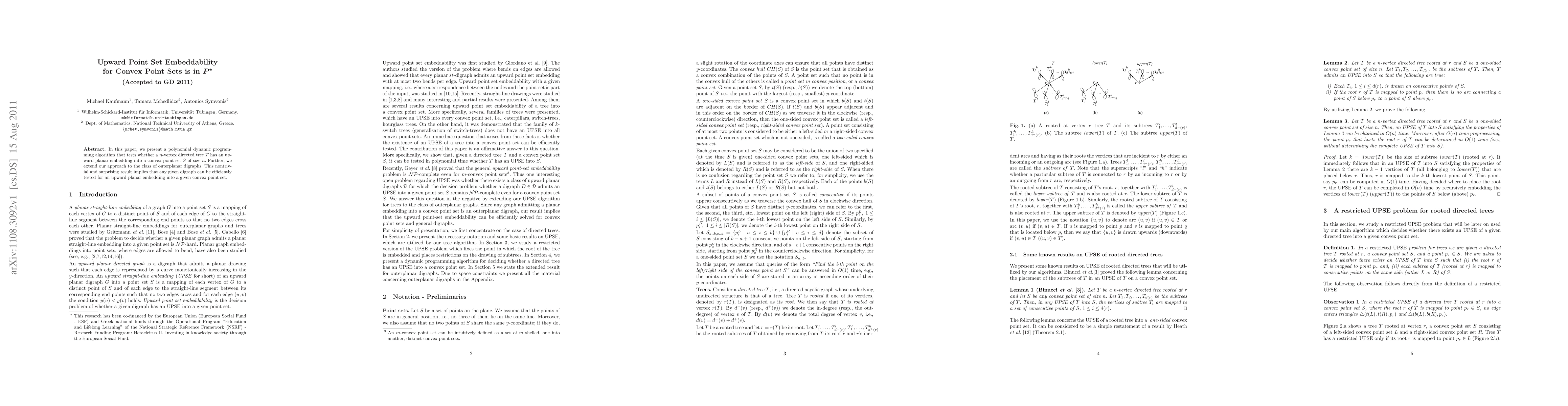 This paper presents a polynomial dynamic programming algorithm to determine if a directed tree can be embedded into a convex point set in an upward planar manner, extending the approach to outerplanar digraphs, thus proving the problem is in $P$. This result enables efficient testing of digraphs for upward planar embeddings into given convex point sets.