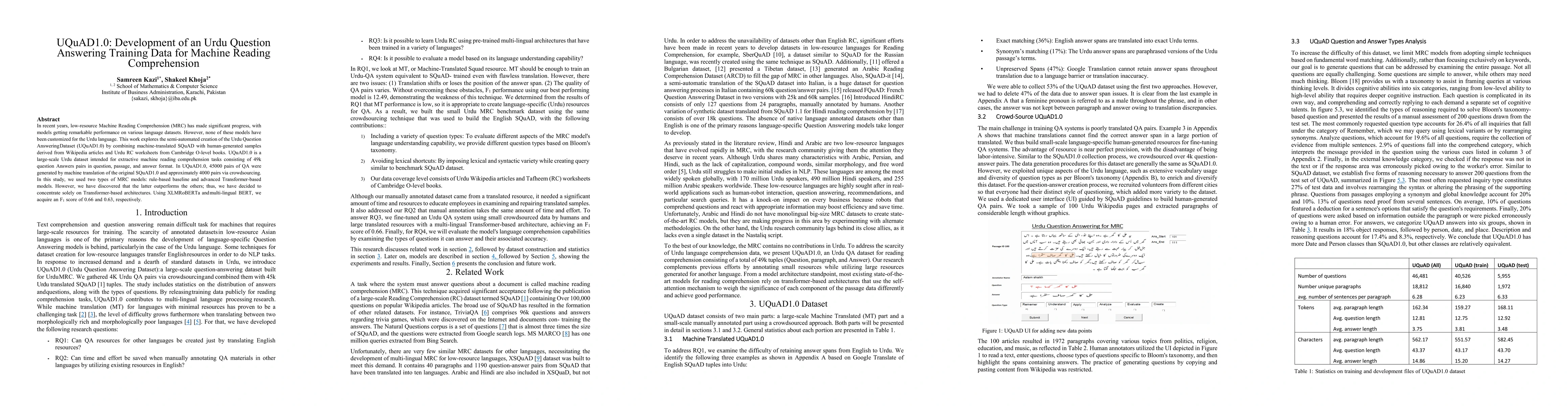 In recent years, low-resource Machine Reading Comprehension (MRC) has made significant progress, with models getting remarkable performance on various language datasets. However, none of these models have been customized for the Urdu language. This work explores the semi-automated creation of the Urdu Question Answering Dataset (UQuAD1.0) by combining machine-translated SQuAD with human-generated samples derived from Wikipedia articles and Urdu RC worksheets from Cambridge O-level books. UQuAD1.0 is a large-scale Urdu dataset intended for extractive machine reading comprehension tasks consisting of 49k question Answers pairs in question, passage, and answer format. In UQuAD1.0, 45000 pairs of QA were generated by machine translation of the original SQuAD1.0 and approximately 4000 pairs via crowdsourcing. In this study, we used two types of MRC models: rule-based baseline and advanced Transformer-based models. However, we have discovered that the latter outperforms the others; thus, we have decided to concentrate solely on Transformer-based architectures. Using XLMRoBERTa and multi-lingual BERT, we acquire an F1 score of 0.66 and 0.63, respectively.