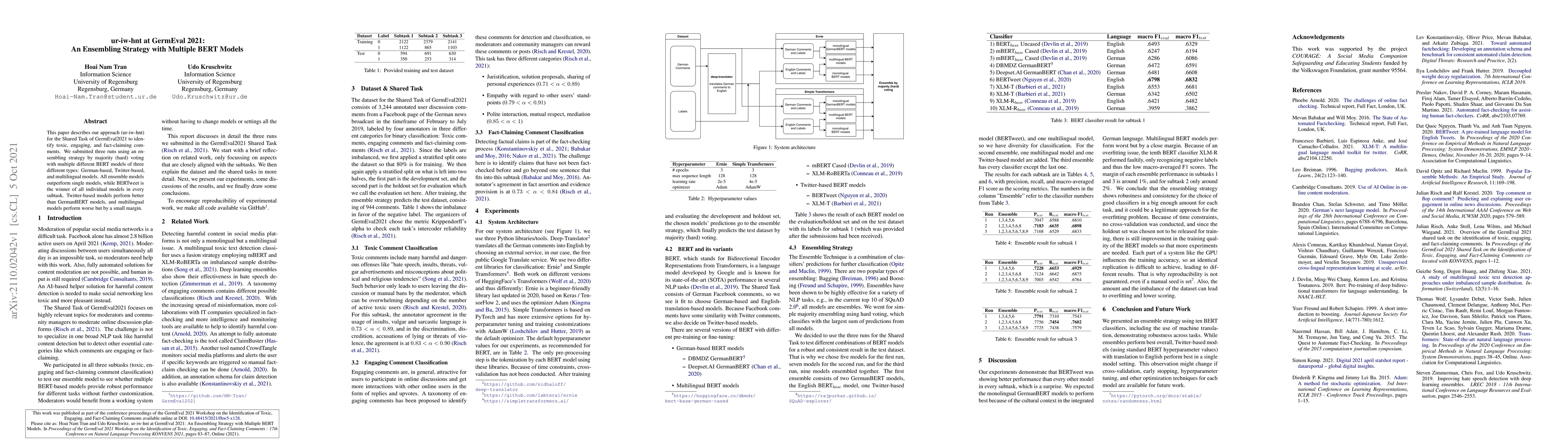 This paper describes our approach (ur-iw-hnt) for the Shared Task of GermEval2021 to identify toxic, engaging, and fact-claiming comments. We submitted three runs using an ensembling strategy by majority (hard) voting with multiple different BERT models of three different types: German-based, Twitter-based, and multilingual models. All ensemble models outperform single models, while BERTweet is the winner of all individual models in every subtask. Twitter-based models perform better than GermanBERT models, and multilingual models perform worse but by a small margin.