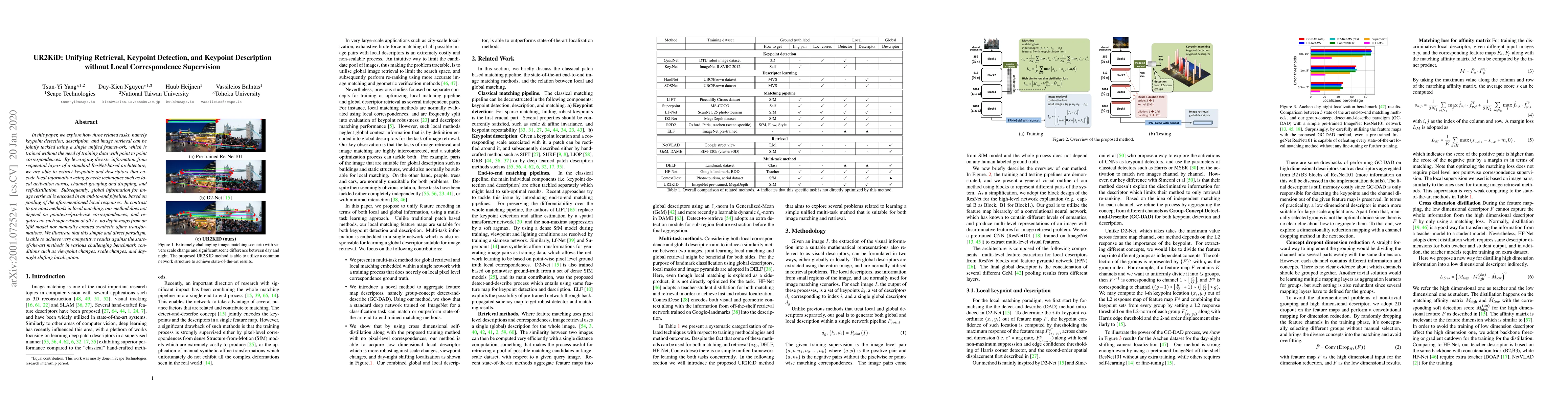 In this paper, we explore how three related tasks, namely keypoint detection, description, and image retrieval can be jointly tackled using a single unified framework, which is trained without the need of training data with point to point correspondences. By leveraging diverse information from sequential layers of a standard ResNet-based architecture, we are able to extract keypoints and descriptors that encode local information using generic techniques such as local activation norms, channel grouping and dropping, and self-distillation. Subsequently, global information for image retrieval is encoded in an end-to-end pipeline, based on pooling of the aforementioned local responses. In contrast to previous methods in local matching, our method does not depend on pointwise/pixelwise correspondences, and requires no such supervision at all i.e. no depth-maps from an SfM model nor manually created synthetic affine transformations. We illustrate that this simple and direct paradigm, is able to achieve very competitive results against the state-of-the-art methods in various challenging benchmark conditions such as viewpoint changes, scale changes, and day-night shifting localization.