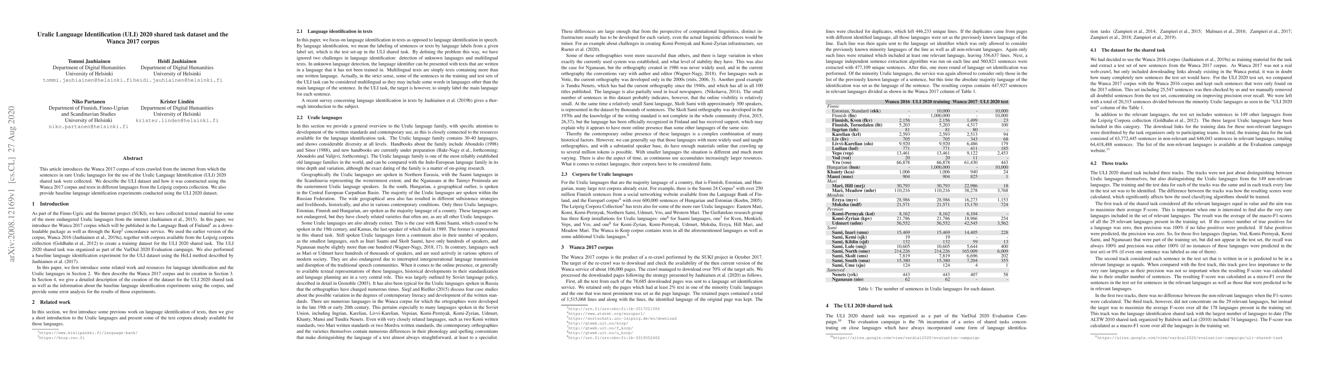 This article introduces the Wanca 2017 corpus of texts crawled from the internet from which the sentences in rare Uralic languages for the use of the Uralic Language Identification (ULI) 2020 shared task were collected. We describe the ULI dataset and how it was constructed using the Wanca 2017 corpus and texts in different languages from the Leipzig corpora collection. We also provide baseline language identification experiments conducted using the ULI 2020 dataset.