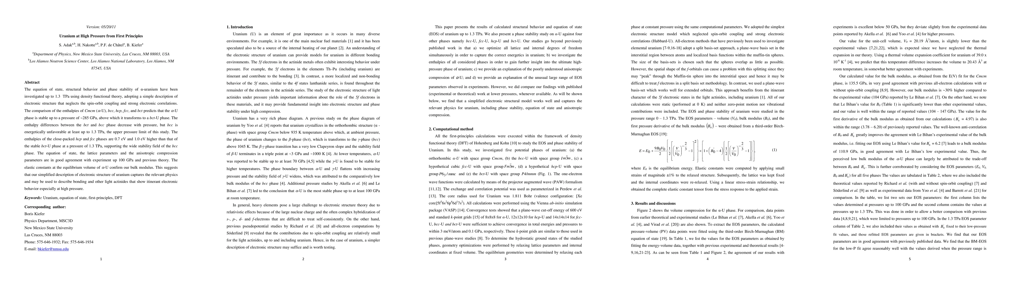 This study investigates the equation of state and phase stability of α-uranium up to 1.3 TPa using density functional theory, predicting that α-U remains stable up to ~285 GPa before transforming to a bct-U phase. The simplified electronic structure model aligns well with experimental data and suggests applicability to other light actinides under high pressure.